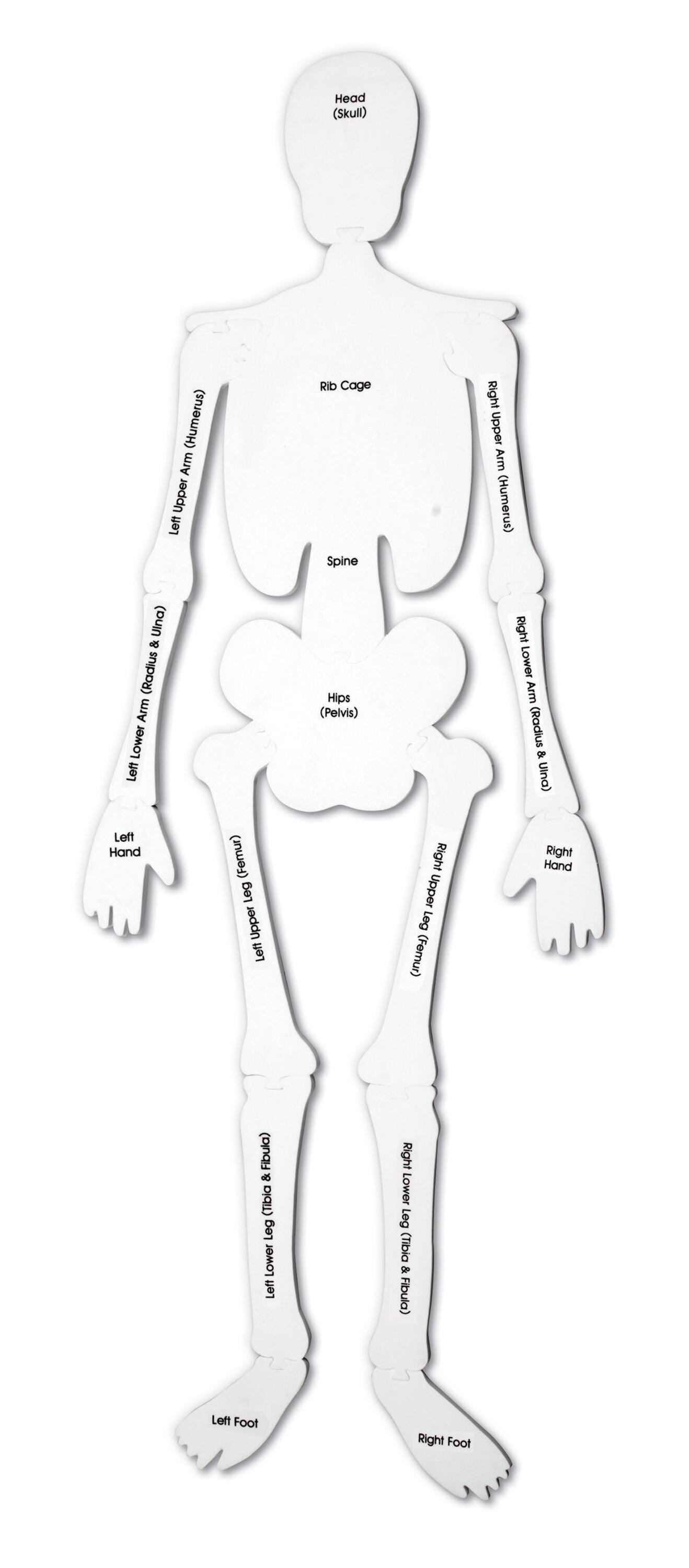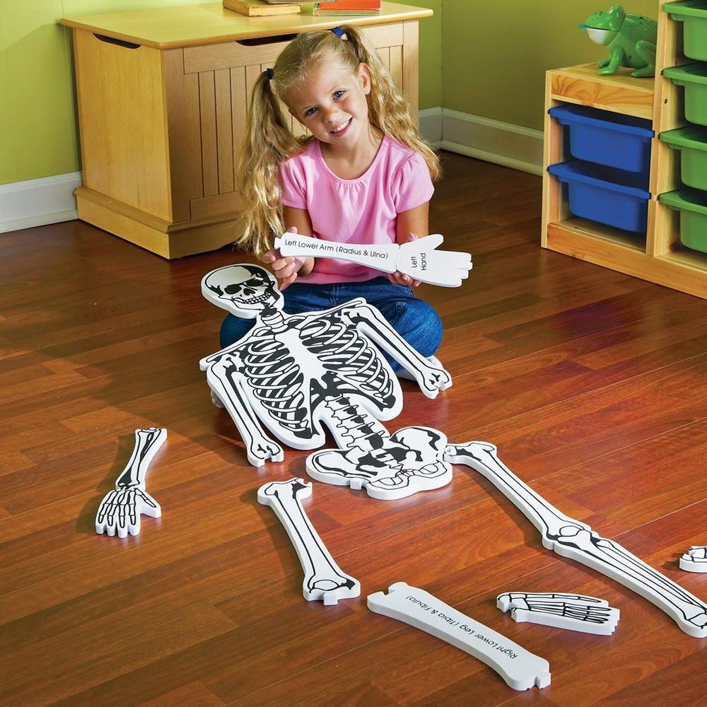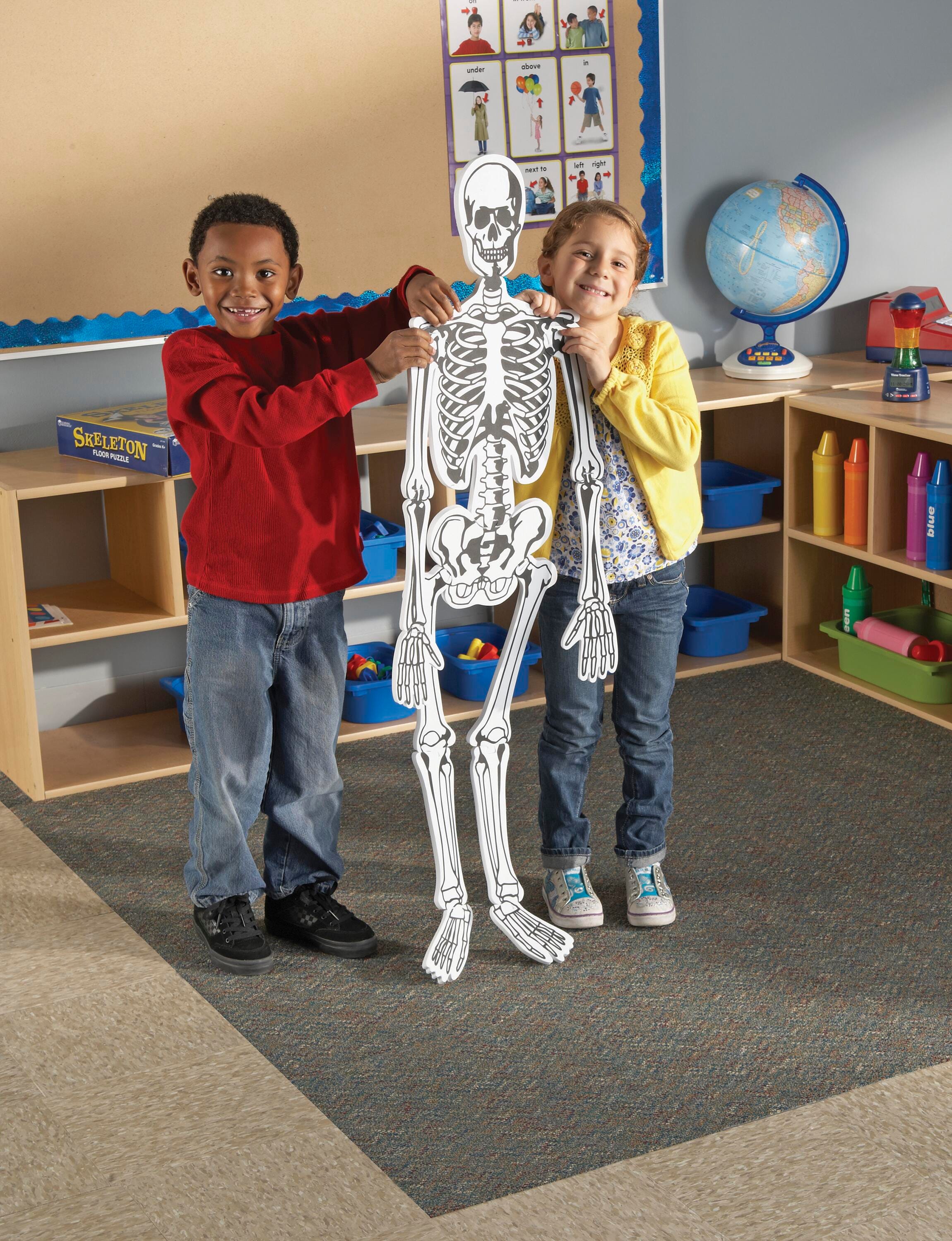 Explore the human body with this unique, life-sized skeleton puzzle. Includes both scientific and common bone names on the reverse side of each piece. Kids can even lie on top of the life-sized puzzle to compare it to their own bodies!