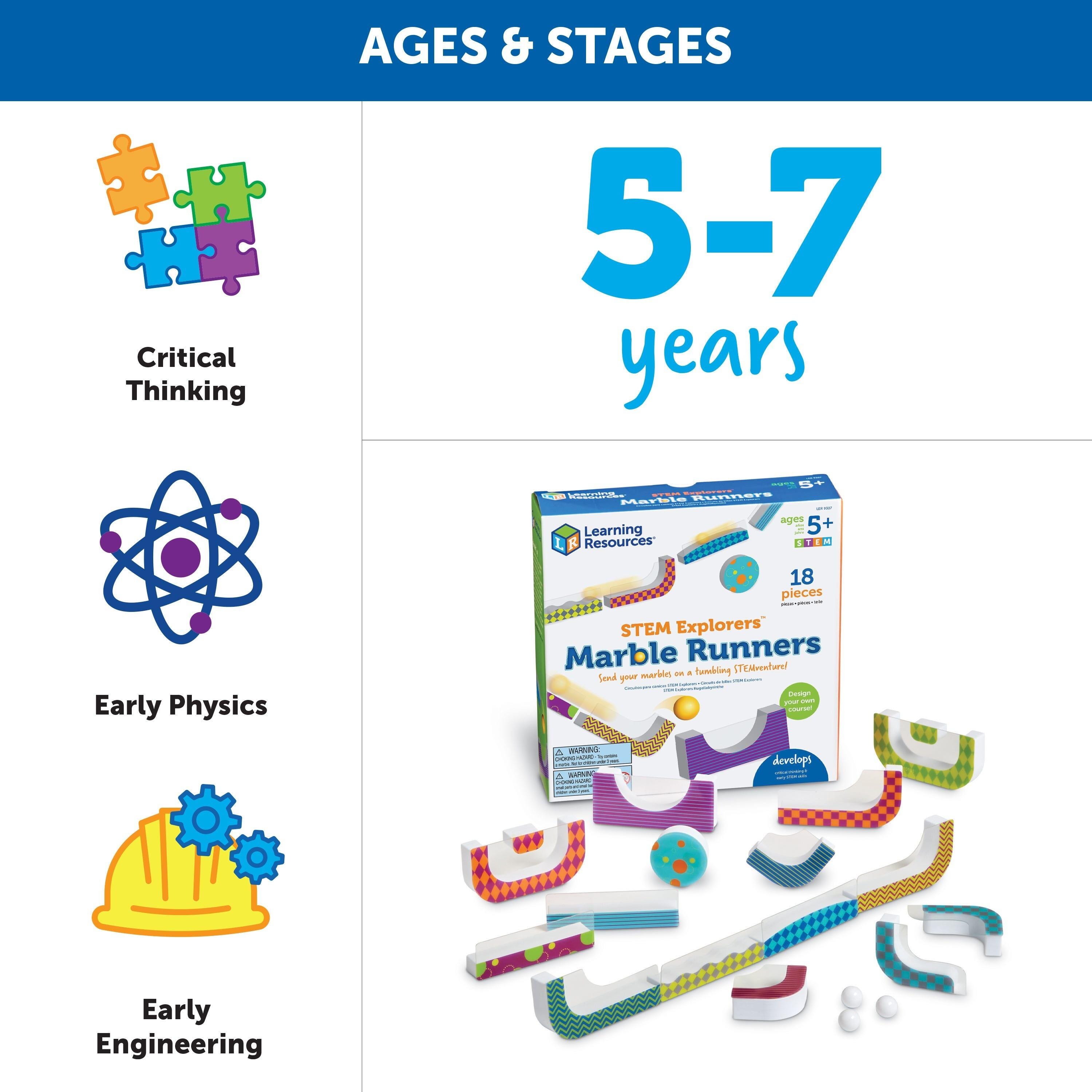 The STEM Explorers™ Marble Runners is an introductory marble set that features Learning Resources Award-winning Tumble Trax. Children can use the set’s cling-back pieces to build marble tracks on walls or windows and solve STEM challenges. No permanent adhesive required! Includes 13 track pieces, 2 balls, and double-sided challenge cards.