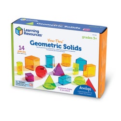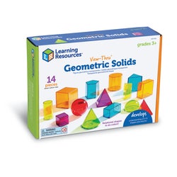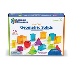 Learning Resources View-Thru Geometric Solids provide a concrete way to explore geometry, volume, and other measurement concepts. Removable bases allow for relating 2-D shapes to 3-D solids. Easy to fill with liquid or dry fill, and easy to clean. Includes large triangular pyramid, square pyramid, hemisphere, sphere, cone, pentagonal prism, small and large cube, rectangular prism, triangular prism, cylinder, and activity guide. Colorful plastic shapes measure 3 or 6 centimeter. Ages 8 and up.Features