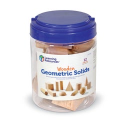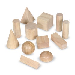 Learning Resources Wooden Geometric Solids are smooth, solid wooden 3-D shapes that measure 2 to 3. Includes: cone, sphere, cube, cylinders, pyramid, prisms, hemisphere, rectangular solids, and activity guide. Ages 6 and up. Grades 1-8. Set of 12.Features