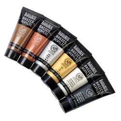Ideal for learning color theory and color mixing, Liquitex BASICS paints offer the ideal working properties at an affordable price. Thick, creamy paint has satin finish and good pigment load for artwork on paper, murals, paper mache crafts, and more. Brush strokes and peaks are retained with every mark made. Iridescent metallic colors are bold, shiny, and true to color. This paint set is intermixable with all Liquitex Professional Acrylic Paint Colors and Mediums. Paints sold as set of 6 tubes in 22 milliliter size.Features