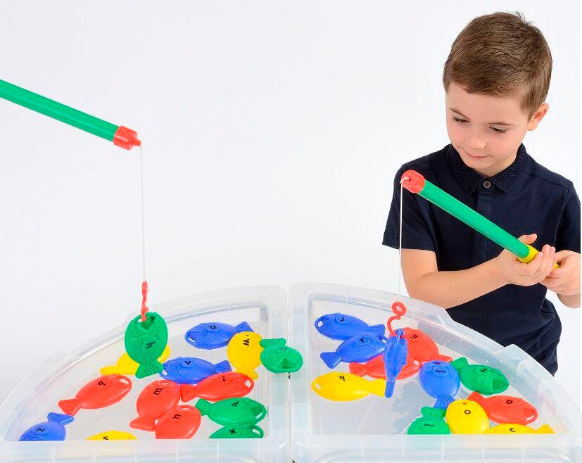 Educational Advantage Small Fishing A-Z is a fun alphabet fishing game that is suitable for indoor and outdoor use. These compact fish float in water and are perfect for table top or sand and water use. Up to 2 players hook the fish with their fishing rods while improving motor skills and hand-eye coordination and learning the alphabet. Fish are approximately 4 inches and fishing rods are 20 inches. Ages 2 and up.Features