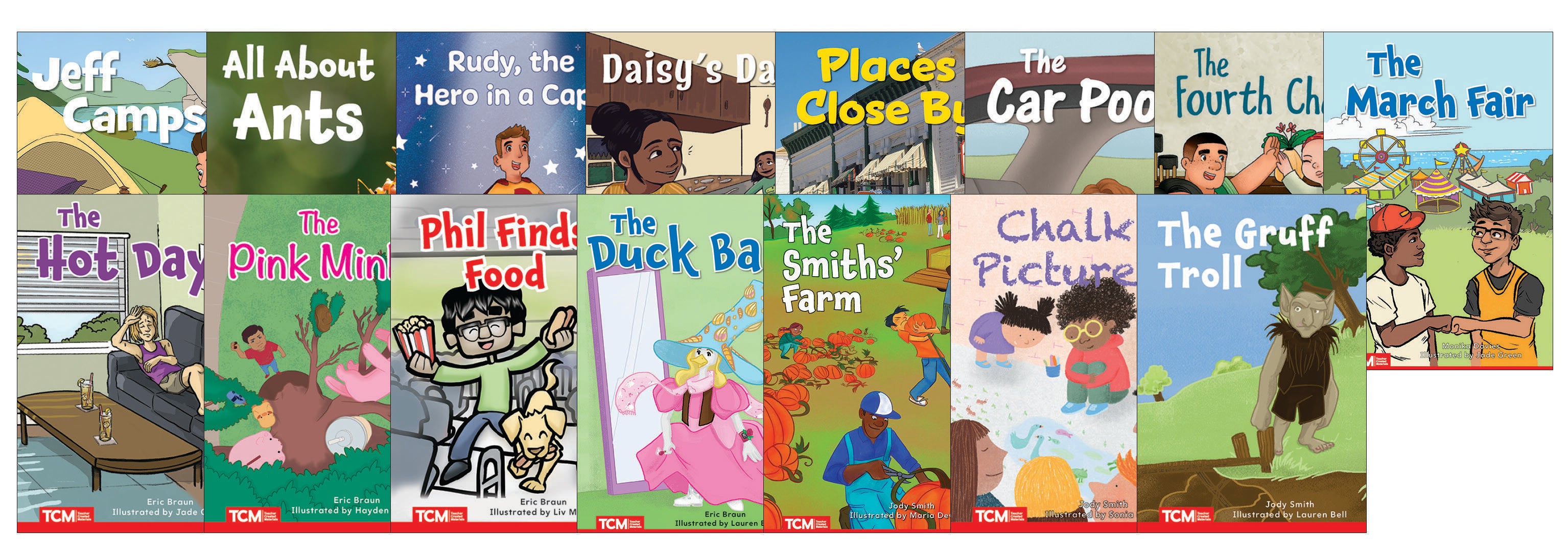 This fun and memorable second-grade set includes sequenced decodable books, #1–#15. Four books in this set are text-first books, offering decoding practice without illustrated clues first, then the text is repeated on the next spread with pictures. Each book includes a helpful family engagement page plus the phonics focus and high-frequency words learned. This set aligns with the Science of Reading and Structured Literacy.- This 15-book set includes: The Hot Day, The Pink Mink, Phil Finds Food, The Duck Ball, The Gruff Troll, The Smith’s Farm, Chalk Pictures, Jeff Camps, All about Ants, Rudy, the Hero in a Cape, Daisy’s Day, Places Close By, The Car Pool, The Fourth Chair, and The March Fair.