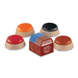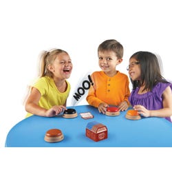 Cock-a-doodle do you know the answer?! Giggle, learn and grow vocabulary with this exciting riddle game! It’s a fruit, it can be red, and it crunches when you take a bite. Buzz if you know the answer! Features 2 levels of game play. Develop Language skills: Students build vocabulary by identifying words based on a description and advanced game play involves critical thinking and expressive language skills to change one clue on the brainteaser card to create a new answer to the riddle. Develop Social & Behavioral skills: Encourages peer interaction, turn taking, socialization and laughter. Patience and waiting may also be practiced when remembering the appropriate time to hit the buzzers! Includes 4 animal sounds buzzers and 150 double sided cards. For 3 or more players. Ages 5 and up, Grade K and up.Features