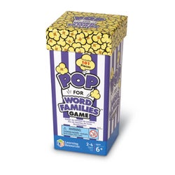 Learning Resources Pop for Word Families Game includes 92 blend cards, 8 POP cards, spinner and guide. Game measuring 3 L x 3 W x 6-1/4 H inches can be played by for 2 to 4 players. Pull out a popcorn piece and create a word with that ending and a POP kernel means all your pieces go back. Start with 2 letter endings then 3 letter endings and rhyming practice. For grades 1 and up.Features