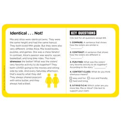 - Word cards prompt students to identify main idea of a story, make inferences, sequence events, compare and contrast, determine author’s purpose, summarize, and more