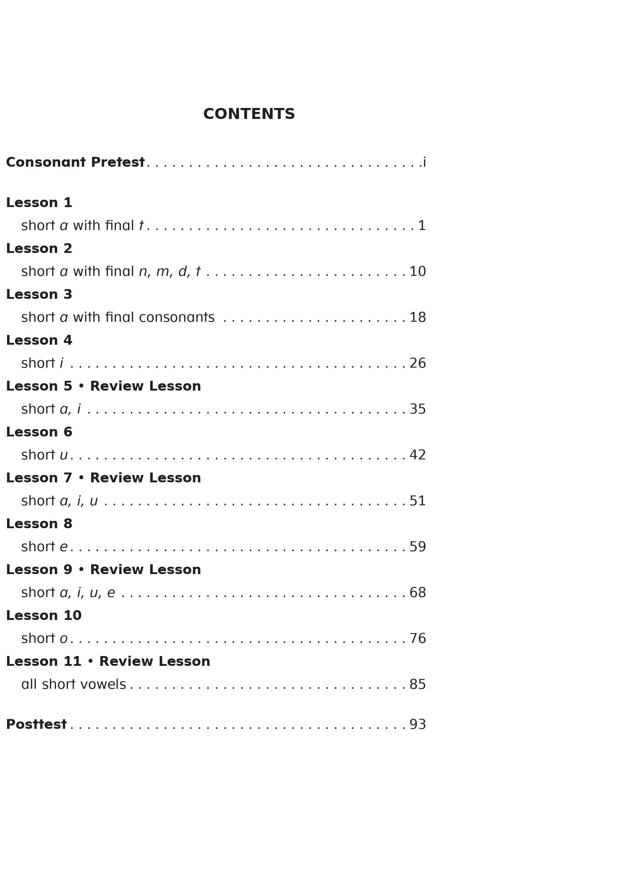 - Book 1 introduces sounds of short vowels (including short a, i, u, e, and o) and the practice of blending sounds to read and write CVC words