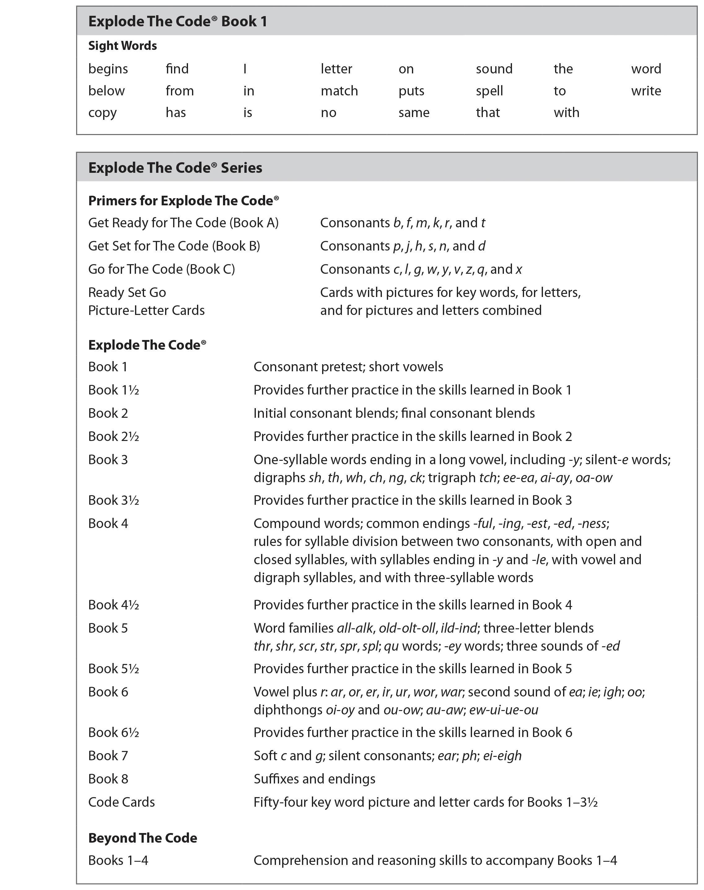 - Explode The Code workbooks help build essential reading skills that include phonemic awareness, phonological awareness, phonics, vocabulary, fluency, spelling, comprehension, and writing