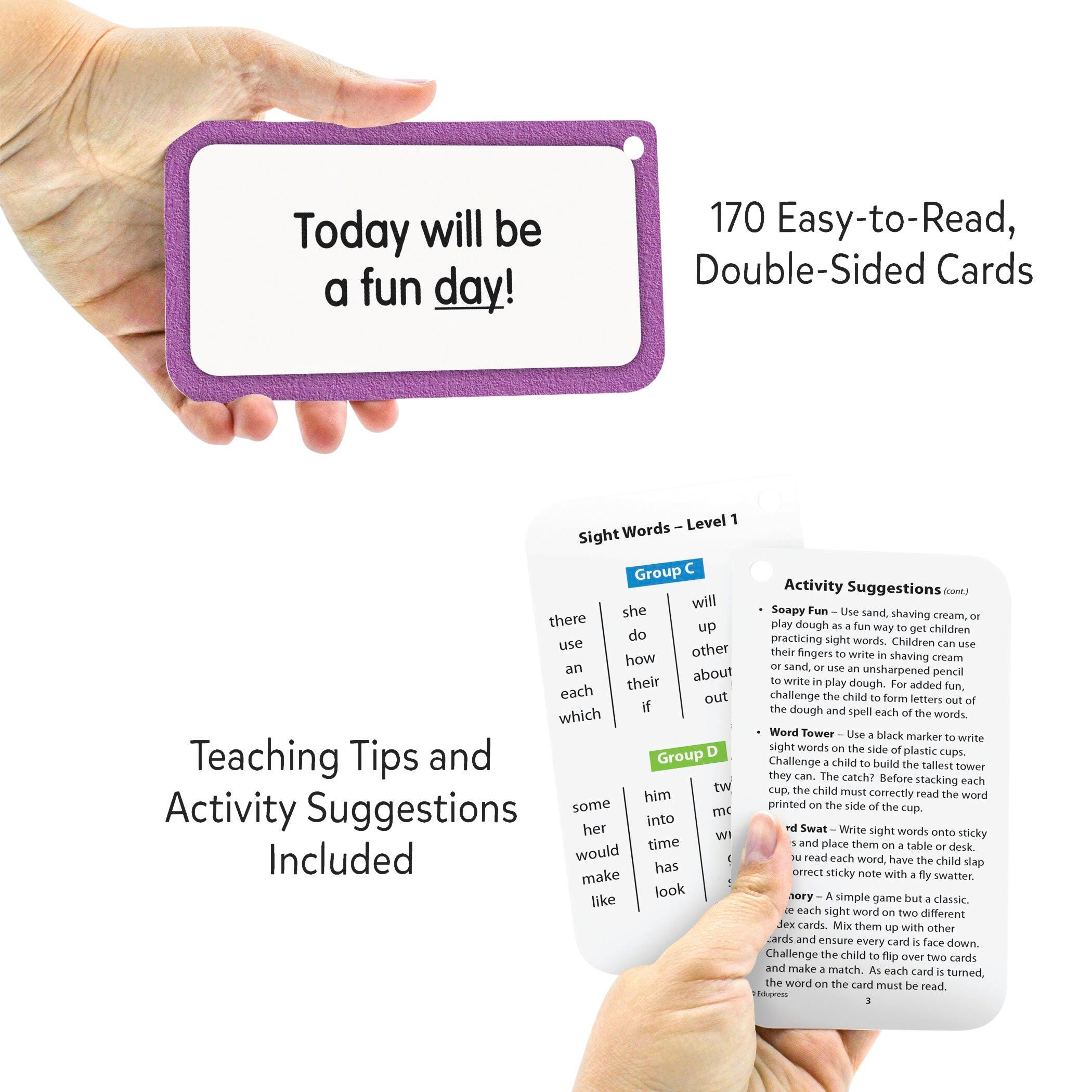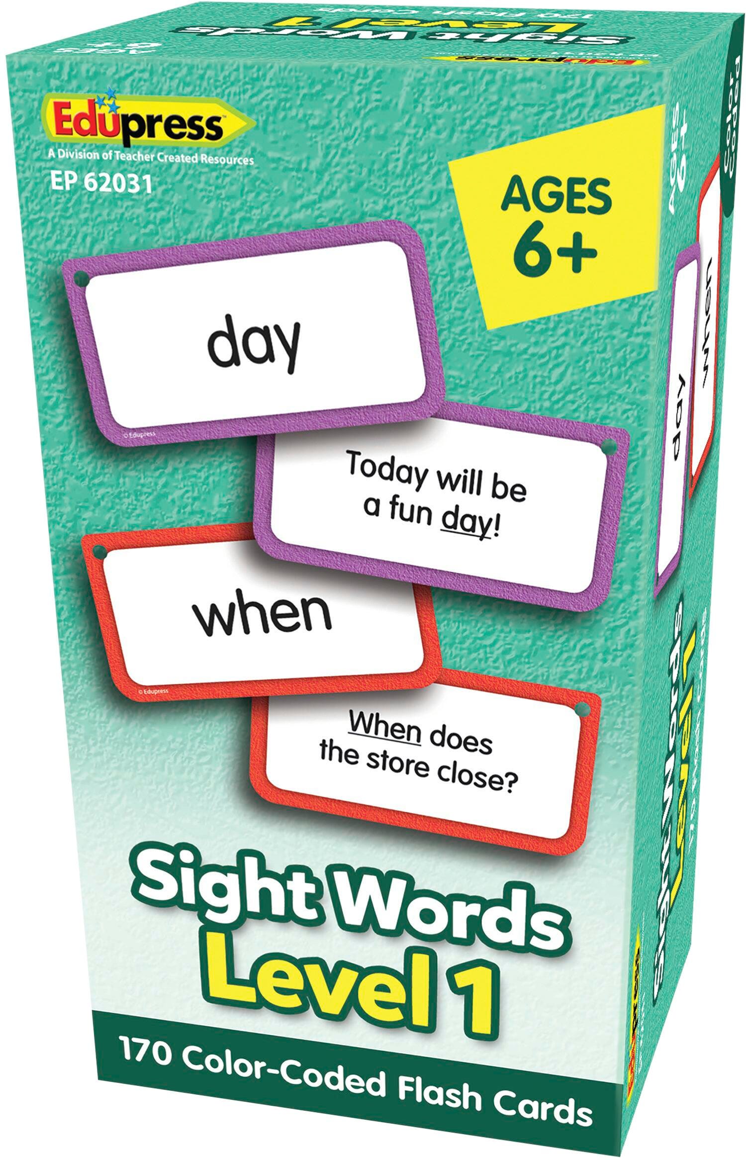 This set of Sight Words Flash Cards from Teacher Created Resources delivers a simple and engaging way to teach and review common words! These handy, full-color flash cards come with a sight word on one side, and a sentence using the word on the other. Each flashcard has a hole punched in the top corner for simple organization and storage. The cards also feature non-rounded, quick-sorting corners that make it easy to face the cards in the same direction. The flash card set includes student cards, instructions and tips for educators, and suggested activities. This set includes 170 double-sided cards, each measuring 3 x 5-3/4 inches.Features