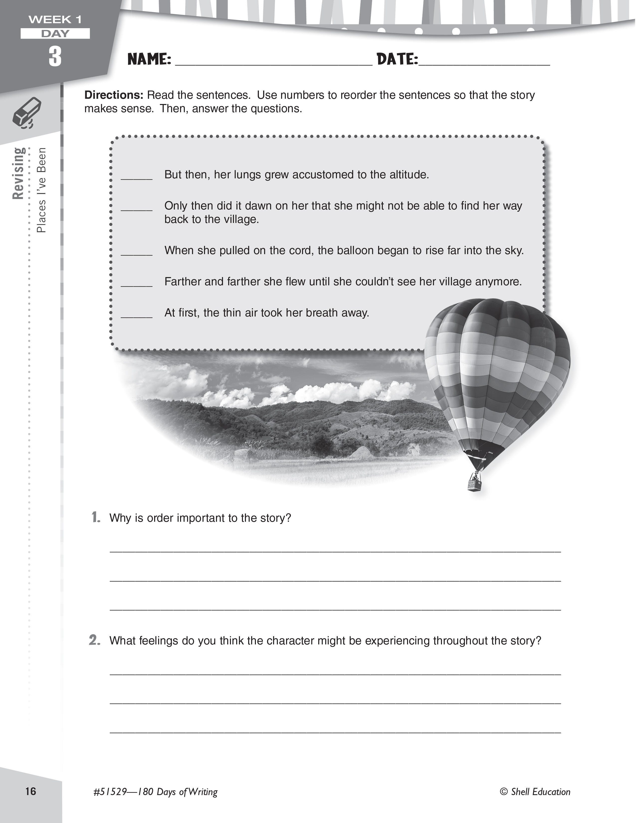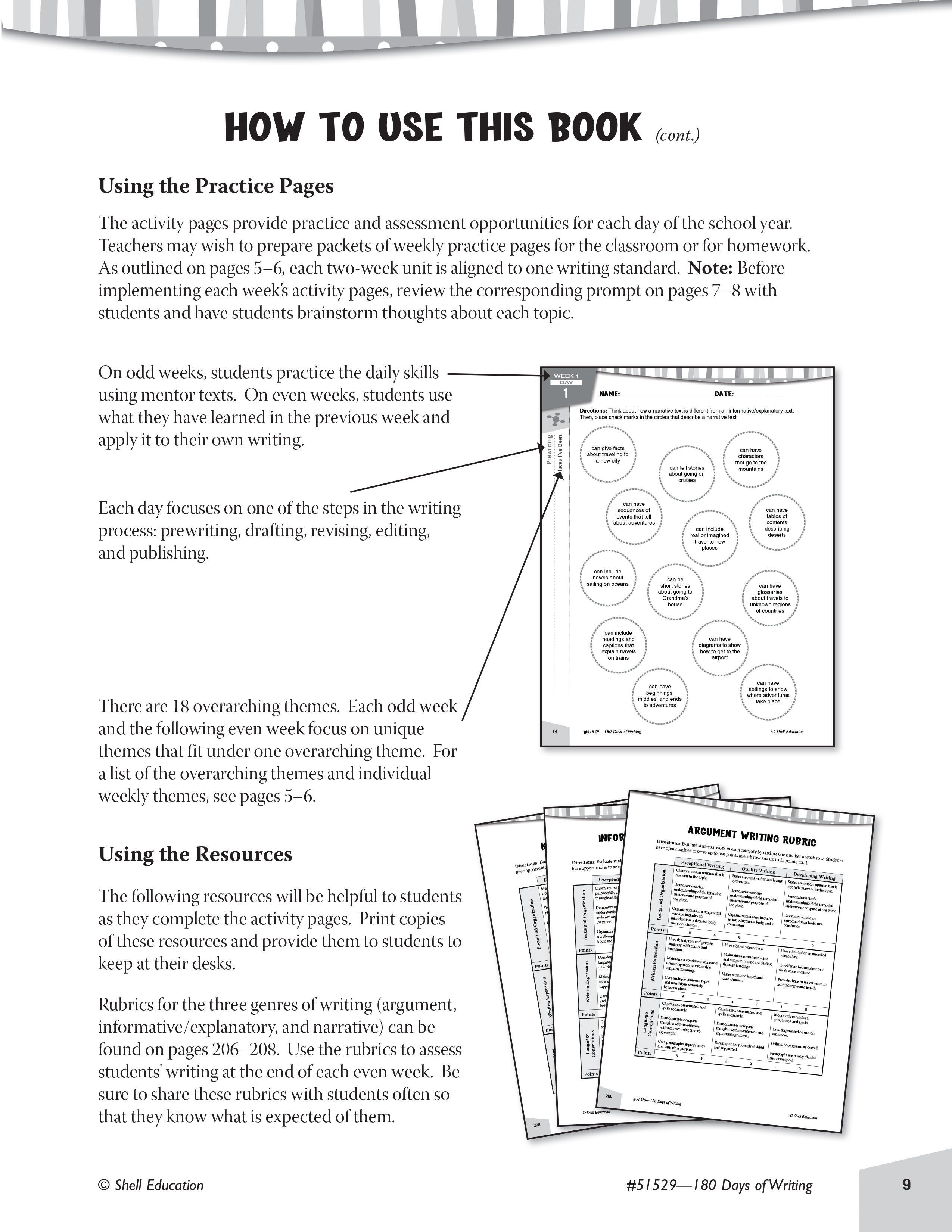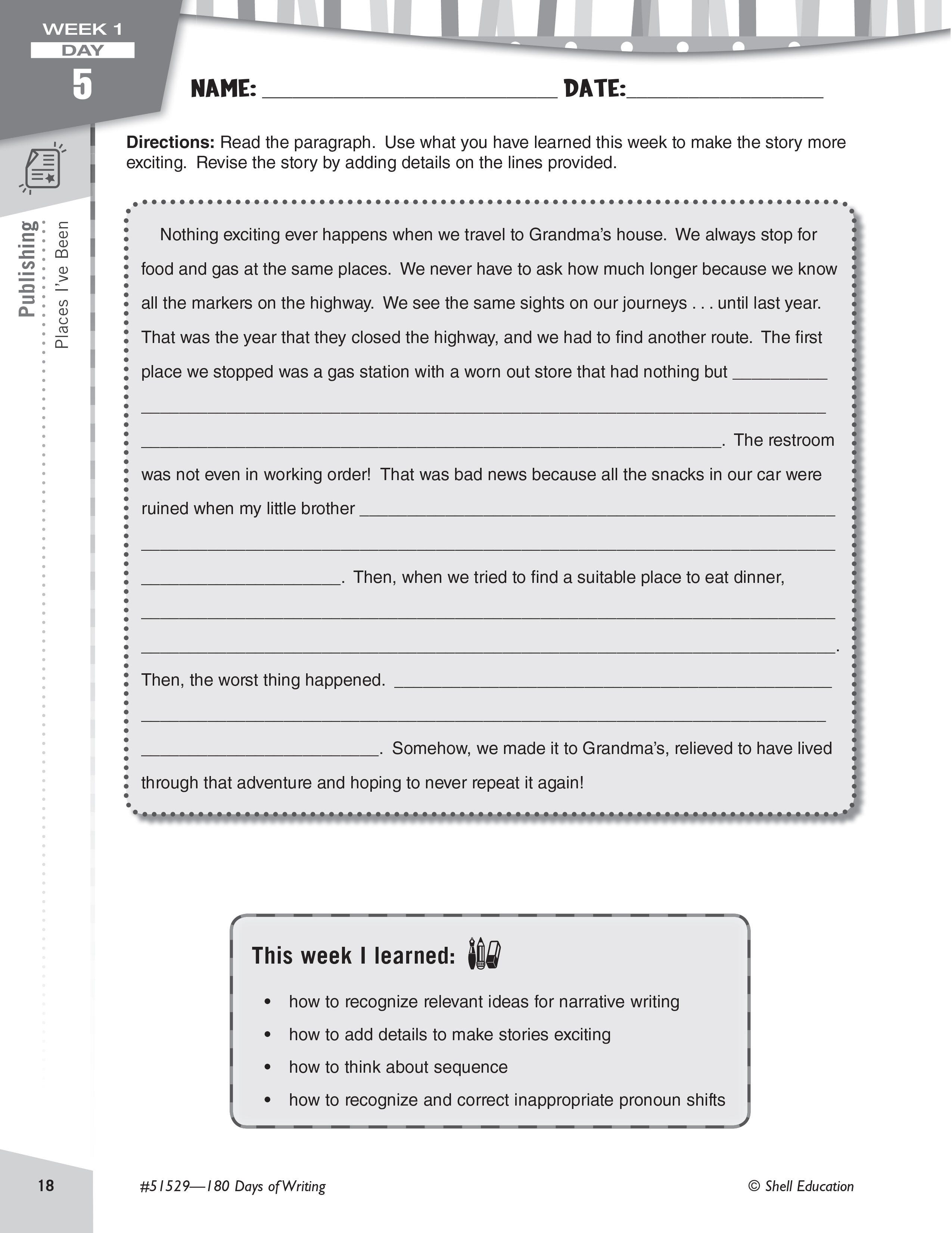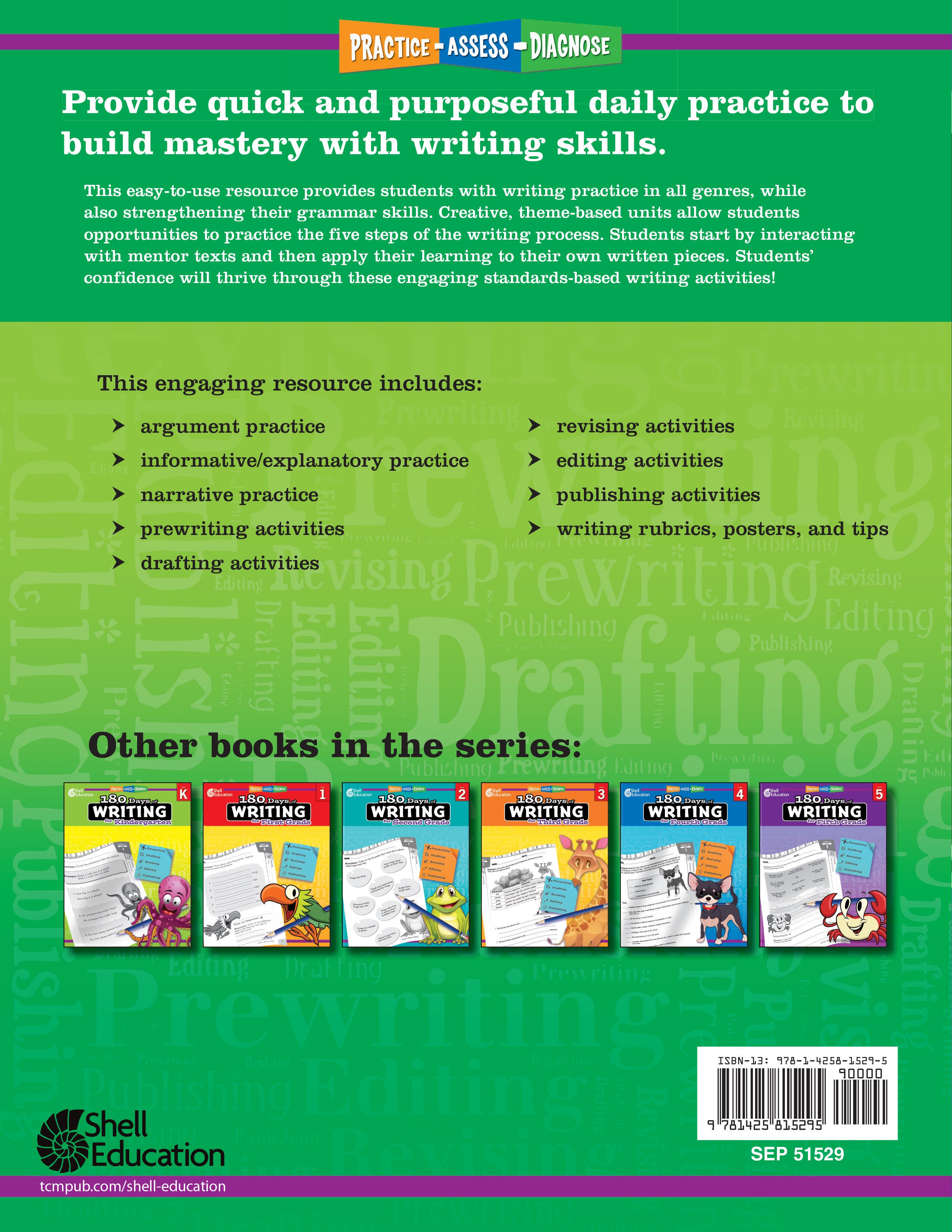 180 Days of Writing is a fun and effective daily practice workbook designed to help students become better writers. This easy-to-use sixth grade workbook is great for at-home learning or in the classroom. The engaging standards-based writing activities cover grade-level skills with easy to follow instructions and an answer key to quickly assess student understanding. Each week students are guided through the five steps of the writing process: prewriting, drafting, revising, editing, and publishing. Watch student confidence grow while building important writing, grammar, and language skills with independent learning.Parents appreciate the teacher-approved activity books that keep their child engaged and learning. Great for homeschooling, to reinforce learning at school, or prevent learning loss over summer.Teachers rely on the daily practice workbooks to save them valuable time. The ready to implement activities are perfect for daily morning review or homework. The activities can also be used for intervention skill building to address learning gaps.