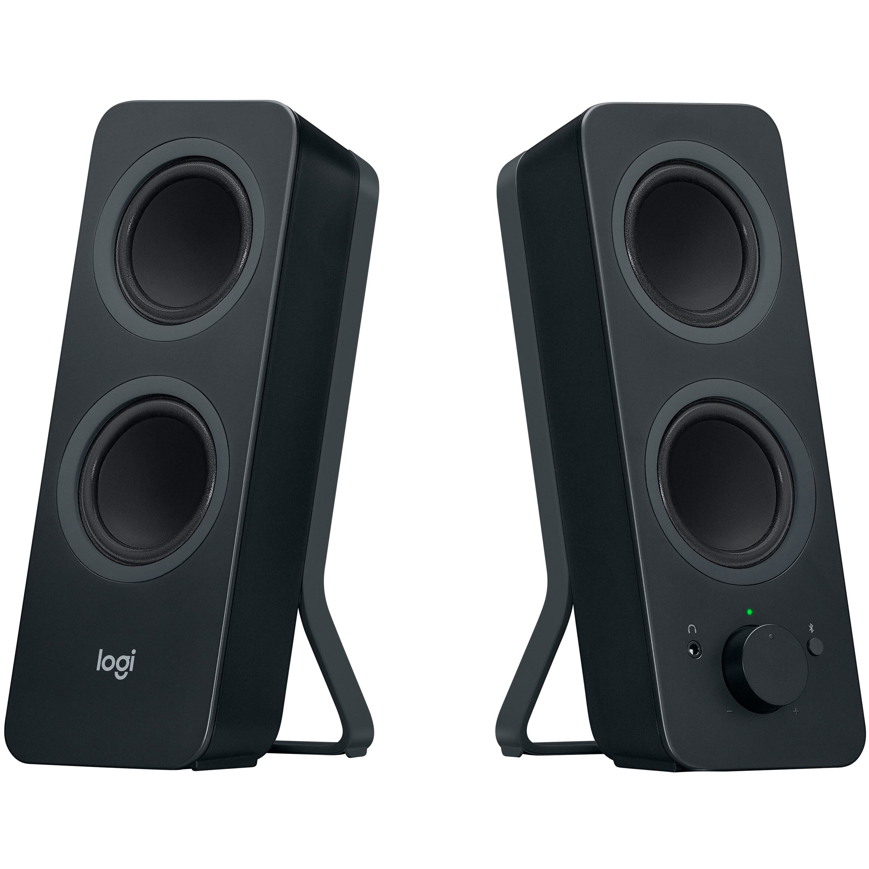 Bluetooth computer speakers deliver rich stereo sound at your desk. Stream audio wirelessly from up to two Bluetooth devices or connect one device via the 3.5mm input. Easy-Switch technology lets you seamlessly switch between audio sources by simply pausing the audio on one and pressing play on the other. 10 watts of peak power delivers room-filling sound from the four-driver design. Plus, two drivers create the perfect balance between the mid and high tones while two passive radiators deliver sharp bass. Easy-to-use controls are conveniently located on the right speaker for quick access to the Bluetooth pairing button, power, volume and headphone jack.Features