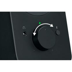 Bluetooth computer speakers deliver rich stereo sound at your desk. Stream audio wirelessly from up to two Bluetooth devices or connect one device via the 3.5mm input. Easy-Switch technology lets you seamlessly switch between audio sources by simply pausing the audio on one and pressing play on the other. 10 watts of peak power delivers room-filling sound from the four-driver design. Plus, two drivers create the perfect balance between the mid and high tones while two passive radiators deliver sharp bass. Easy-to-use controls are conveniently located on the right speaker for quick access to the Bluetooth pairing button, power, volume and headphone jack.Features