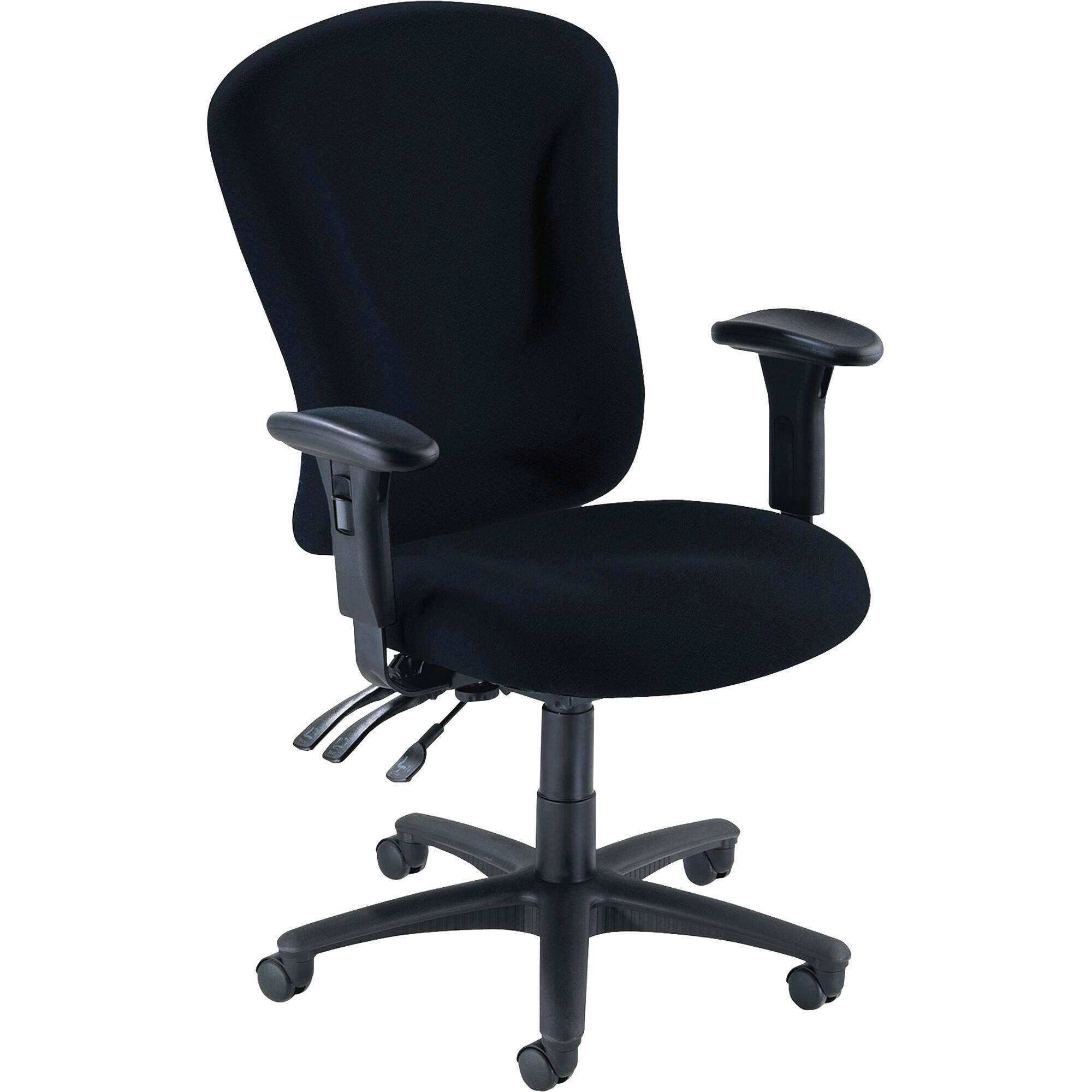 Managerial task chair features adjustable arms and contoured seat and back with molded foam that provides long-lasting comfort. Waterfall seat provides under-thigh support. Arms adjust in width from 18 to 19-1/2 inches. Functions include pneumatic seat-height adjustment (18-1/10 to 21-7/10 inches high from floor), back-height adjustment, 360-degree swivel, tilt lock and asynchronous control. Task chair offers a 225 lb. weight capacity and is available in black frame only. The fabric is 100 percent polyester.