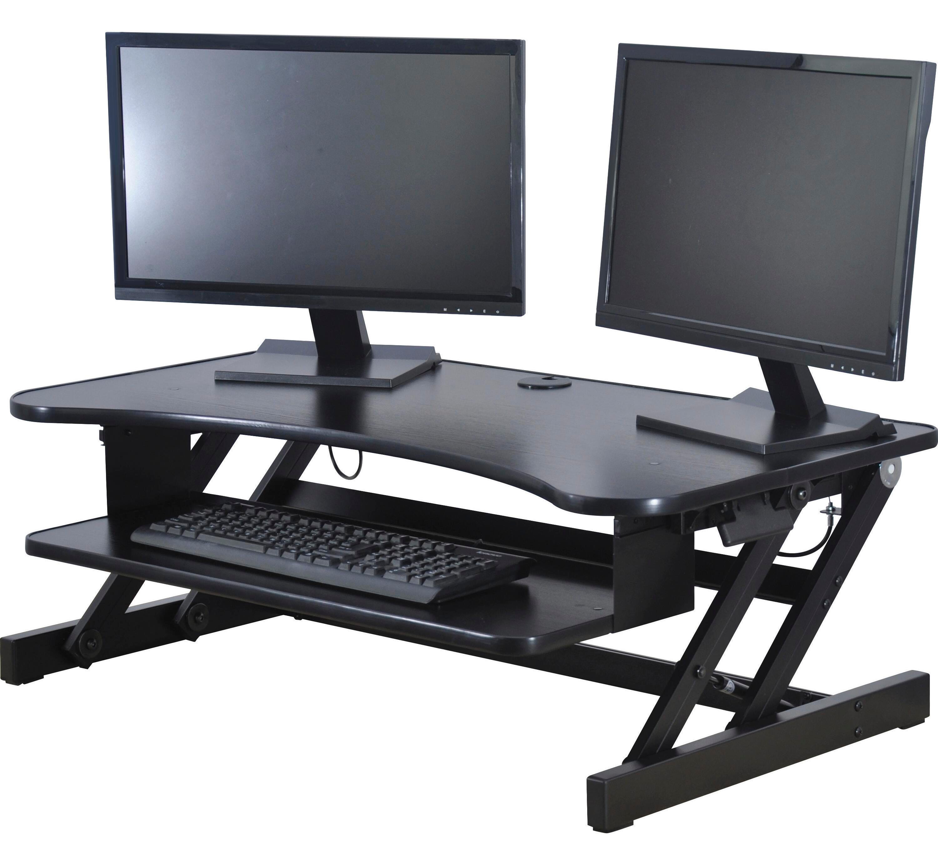 Deluxe adjustable desk riser offers a healthy addition to any desk that allows you to sit or stand while you work. The large, 37-1/4 W x 20-1/2 D inches work surface accommodates two monitors or a monitor and a laptop. Ergonomic keyboard tray moves up and down with the desk and moves out or in for the most comfortable position. Five height adjustments (from 6-1/2 up to over 16-3/10 inches above your desk) allow a comfortable standing position. Easily raise or lower the riser with the adjustable paddles in the front for user-friendly operation. Gas spring will allow you to easily move the desk up and down, even with your computer equipment. Riser is fully assembled for use right out of the box.