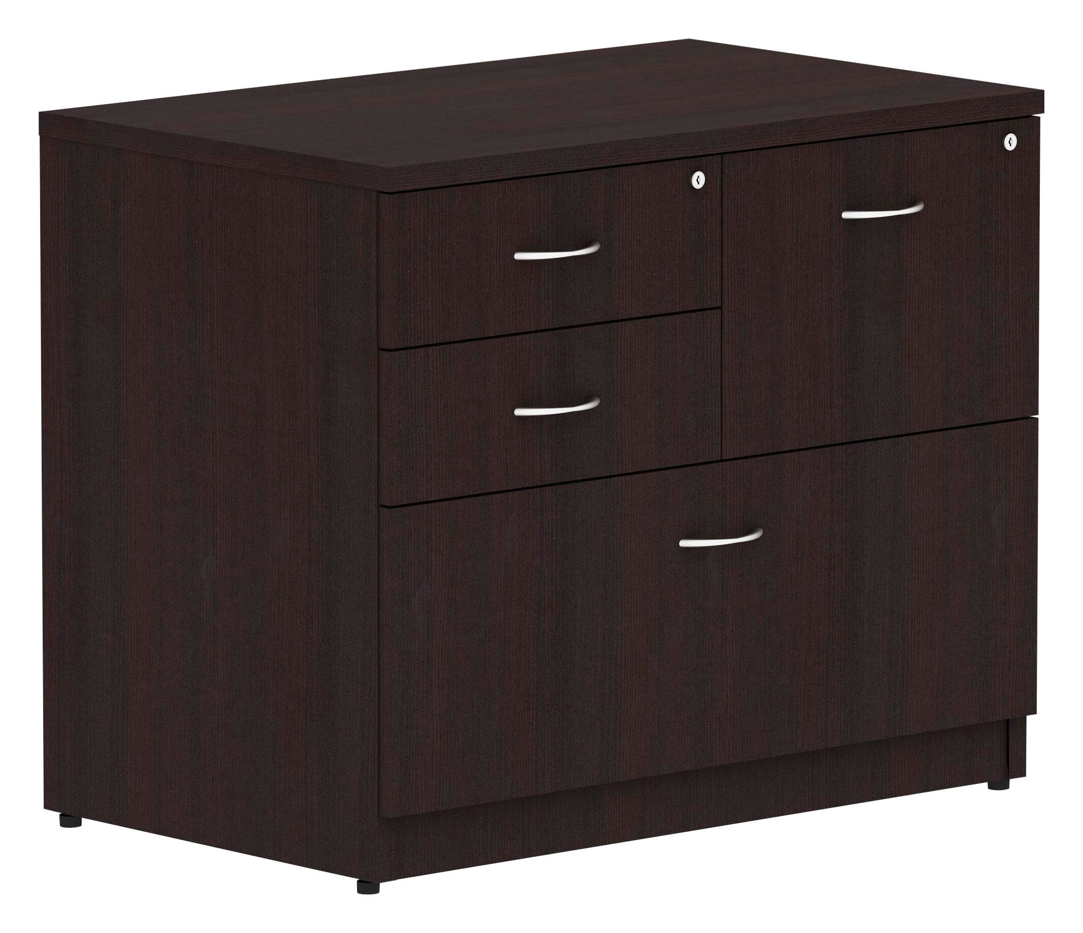Versatile, four-drawer lateral file is part of Lorell Essentials Series Laminate Furniture with high-quality laminate construction and a contemporary design. Innovative design includes two box drawers to store supplies, a file drawer next to the box drawers and a lateral file as the bottom drawer. Both file drawers accommodate letter-size and legal-size files with included hangrails. Drawers roll smoothly on steel ball-bearings with full extension. The top box and file drawer lock for security. Espresso laminate top and side panels are 1" thick for durability. Design also includes 3mm PVC edges and adjustable levelers for stabilization.