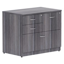 Versatile, four-drawer lateral file is part of Lorell Essentials Series Laminate Furniture with high-quality laminate construction and a contemporary design. Innovative design includes two box drawers to store supplies, a file drawer next to the box drawers and a lateral file as the bottom drawer. Both file drawers accommodate letter-size and legal-size files with included hangrails. Drawers roll smoothly on steel ball-bearings with full extension. The top box and file drawer lock for security. Weathered Charcoal laminate top and side panels are 1 inch thick for durability. Design also includes 3mm PVC edges and adjustable levelers for stabilization.