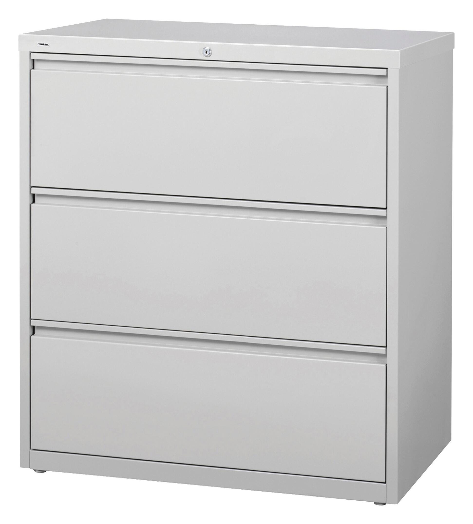 Lorell Telescoping Suspension Lateral File with hanging file rails facilitates side-to-side filing in letter-size, legal-size or A4-size folders. File contains three-Drawers and each-Drawer features a magnetic label holder for easy identification. The four adjustable leveling glides offer stabilization and the ball-bearing slide suspension facilitates smooth operation. The interlock system inhibits the extension of more than one-Drawer at a time and the counterweight avoids tipping. It comes with a core-removable lock for security, dual locking bars, full-width pull and a reinforced base. 36 W x 18-5/8 D x 40-1/4 H inches. Light Gray. Meets or exceeds applicable ANSI or BIFMA standards.Includes: Hanging File Rails