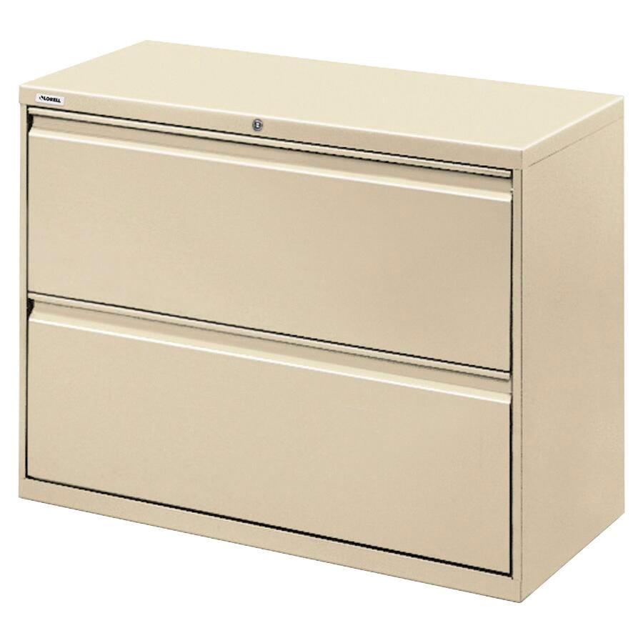 Lorell Interlocking System Lateral File with hanging file rails facilitates side-to-side filing in letter-size, legal-size or A4-size folders. File contains two-Drawers and each-Drawer features a magnetic label holder for easy identification. The four adjustable leveling glides offer stabilization and the ball-bearing slide suspension facilitates smooth operation. The interlock system inhibits the extension of more than one-Drawer at a time and the counterweight avoids tipping. It comes with a core-removable lock for security, dual locking bars, full-width pull and a reinforced base. 42 W x 18-5/8 D x 28-1/8 H inches. Putty. Meets or exceeds applicable ANSI or BIFMA standards.Features