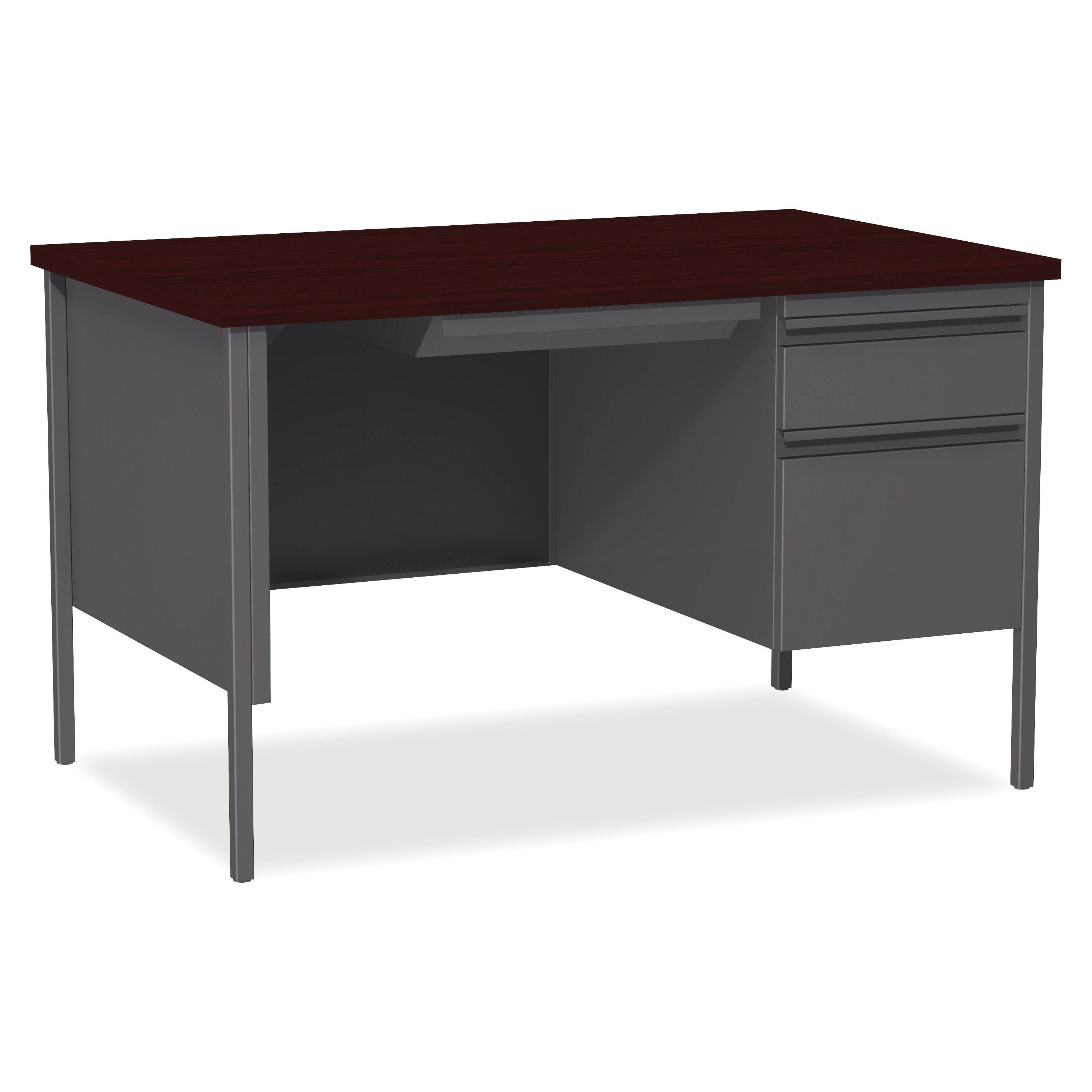 Lorell Fortress Series Desk offers a practical and professional desk solution ideal for business, government and educational offices. Durable, high-performance steel construction withstands rigorous daily use. The 1-1/8 inch thick top with square edges features a Mahogany laminate surface that is scratch-resistant, stain-resistant and water-resistant. Desks are also equipped 3/4 modesty panels and 3/4 box/file pedestals with full-extension, ball-bearing slides and a locking center drawer. Integrated drawer pulls are full-width. Central-locking center drawer on desks include a core-removable lock. Reinforced, double-frame inner structure keeps desk solid and sturdy for years of use. Steel Desk meets or exceeds ANSI/BIFMA standards. Each unit is sold separately.