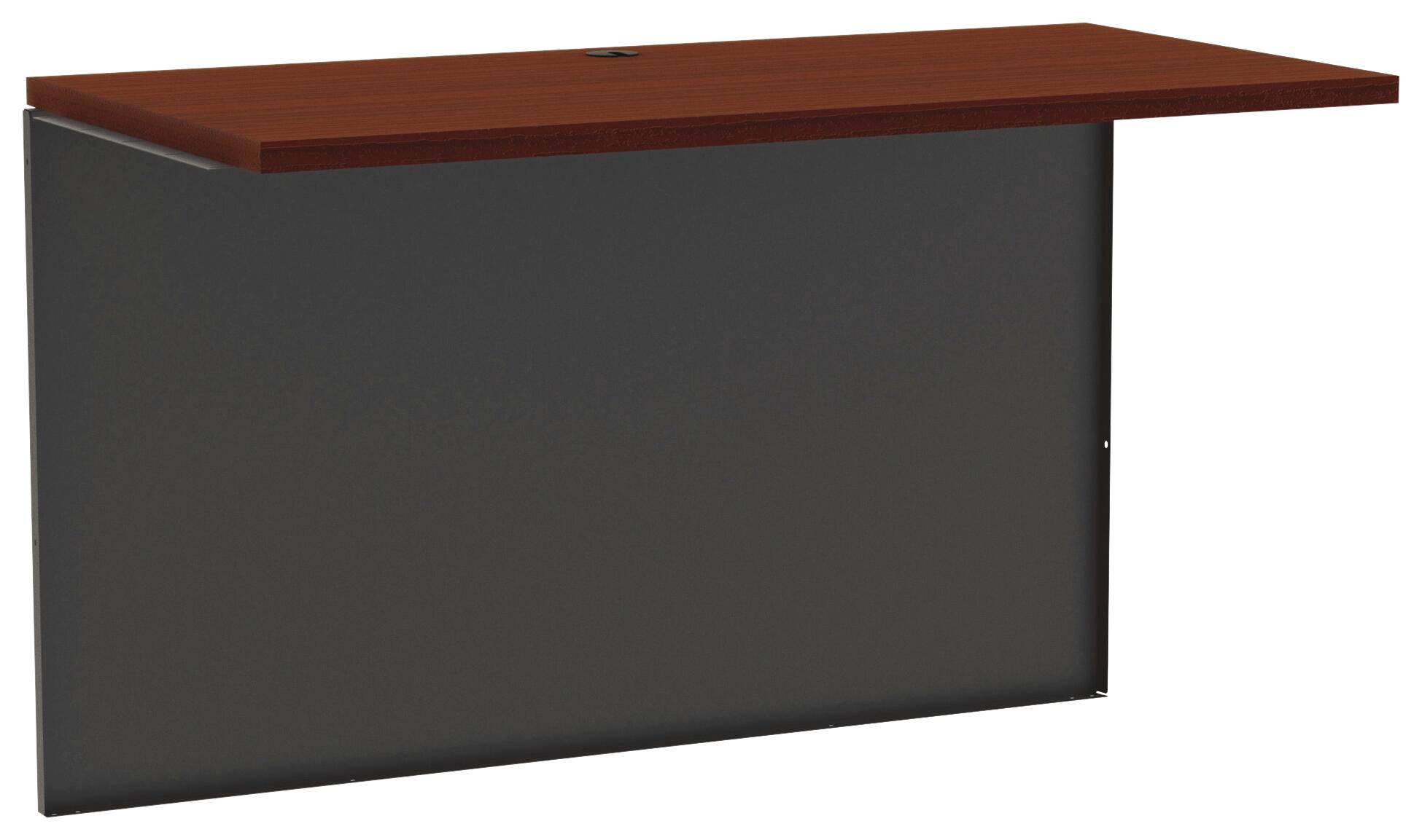 This modular desk series features commercial-quality performance and components. The durable steel chassis supports a 1-1/8" thick laminated top with integrated grommets for wire management. Laminate is stain-resistant and scratch-resistant for durability. To create a U-workstation, simply combine a desk with a bridge and credenza. Desk includes one box drawer for supplies and one file drawer for documents. File drawers with premium arch-pull handles accept hanging file folders for paper management. Steel ball-bearing suspension makes drawers easy to operate quietly. Built-in cord management provides easy access to power and data while minimizing clutter. The rich mahogany laminate and charcoal paint create an upscale look and feel for any application. Superior steel construction withstands heavy activity and relocation.