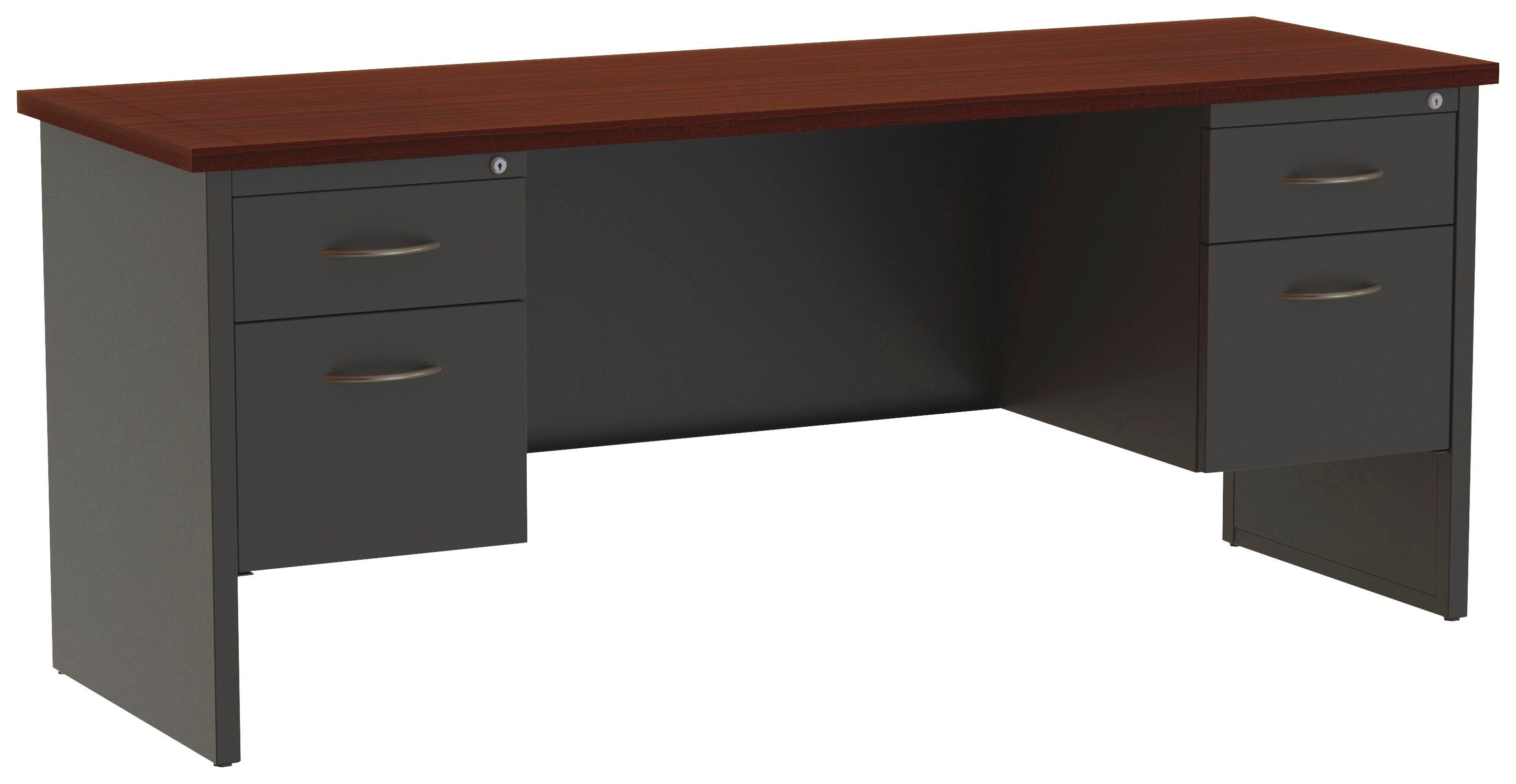 This modular desk series features commercial-quality performance and components. The durable steel chassis supports a 1-1/8" thick laminated top with integrated grommets for wire management. Laminate is stain-resistant and scratch-resistant for durability. To create a U-workstation, simply combine a desk with a bridge and credenza. Desk includes one box drawer for supplies and one file drawer for documents. File drawers with premium arch-pull handles accept hanging file folders for paper management. Steel ball-bearing suspension makes drawers easy to operate quietly. Built-in cord management provides easy access to power and data while minimizing clutter. The rich mahogany laminate and charcoal paint create an upscale look and feel for any application. Superior steel construction withstands heavy activity and relocation.