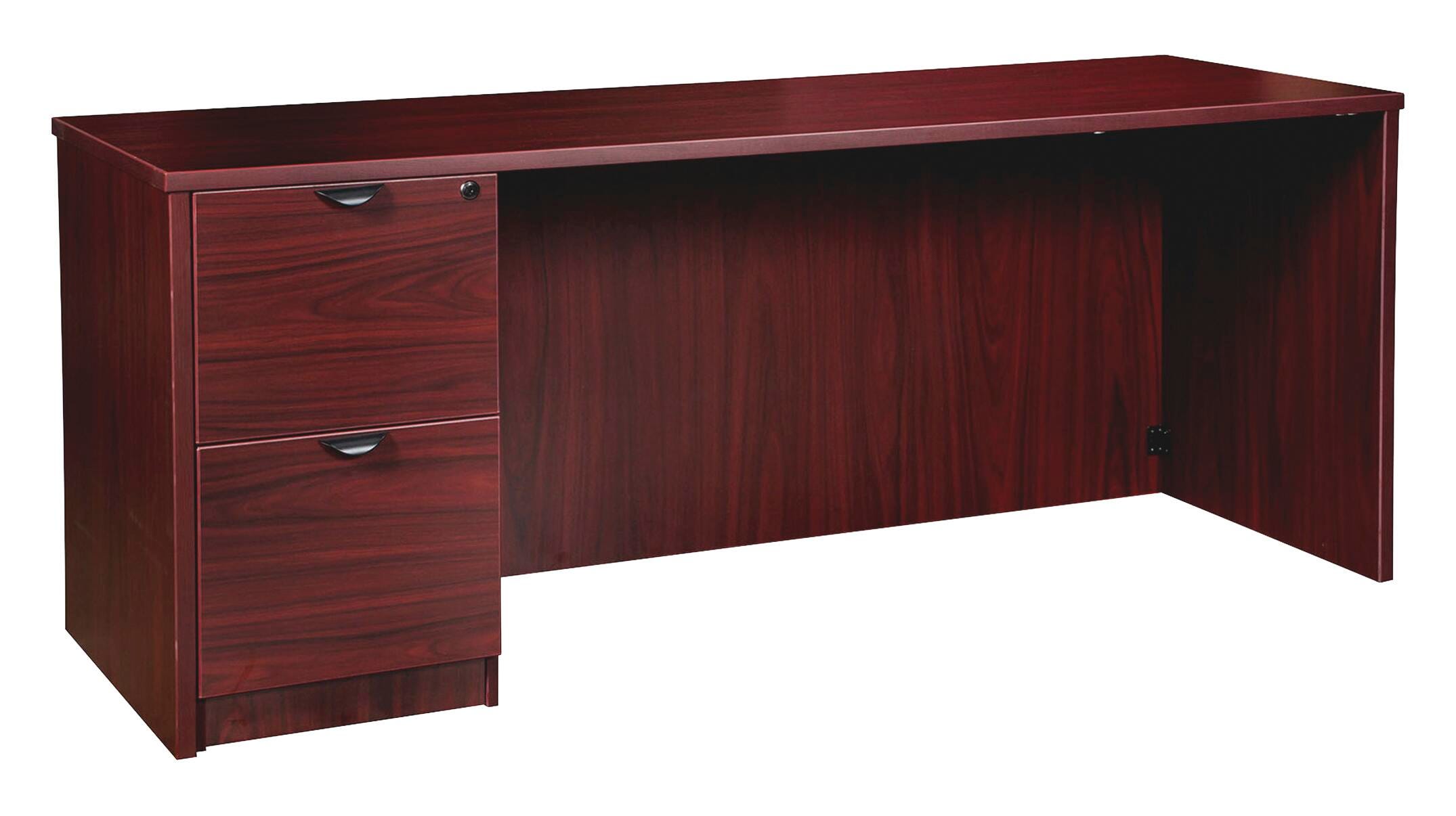 Left-pedestal credenza pairs perfectly with single-pedestal desks, returns and bridges to create L-shaped and U-shaped configurations. Durable, mahogany laminate surface is mar-resistant, burn-resistant and impact-resistant to withstand daily work life. The 1-inch thick top with matching 3mm edgebanding is made with 45-pound density particleboard and finished on both sides with high-performance, thermally fused melamine. Freestanding, 66-inch wide credenza features a full modesty panel for privacy, single grommet in the top and back for easy cord routing, and one full pedestal with two locking file drawers to secure your important documents in letter-size and legal-size hanging files with included hangrails. File drawers have 100 pounds full-suspension, ball-bearing slides. The 3/4-inch adjustable glides allow credenza to remain level on uneven surfaces. Ships fully assembled.Includes: