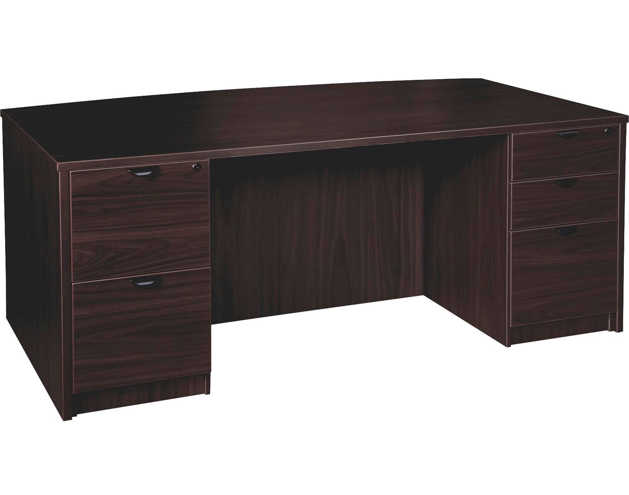 Double-pedestal desk features a durable, espresso laminate surface is mar-resistant, burn-resistant and impact-resistant to withstand daily work life. The 1-inch thick top with matching 3mm edgebanding is made with 45-pound density particleboard and finished on both sides with high-performance, thermally fused melamine. The 72-inch wide desk features a full modesty panel for privacy, two grommets in the top, and two pedestals with locking drawers to secure files and supplies. One pedestal includes two file drawers while the other pedestal includes two box drawers for supplies and one more file drawer for additional file space. File drawers hold letter-size or legal-size hanging files with included hangrails. Box and file drawers have 100 pounds full-suspension, ball-bearing slides. The 3/4-inch adjustable glides allow desk to remain level on uneven surfaces. Ships fully assembled.Includes: