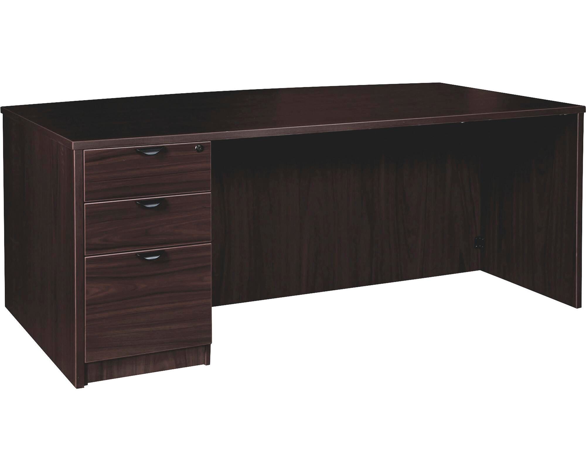 Left-pedestal desk pairs perfectly with single-pedestal desks, returns and bridges to create L-shaped and U-shaped configurations. Durable, espresso laminate surface is mar-resistant, burn-resistant and impact-resistant to withstand daily work life. The 1-inch thick top with matching 3mm edgebanding is made with 45-pound density particleboard and finished on both sides with high-performance, thermally fused melamine. The 72-inch wide desk features a full modesty panel for privacy, two grommets in the top, and a full pedestal with locking drawers to secure files and supplies. Pedestal includes two box drawers for supplies and one file drawer for letter-size or legal-size hanging files with included hangrails. Box and file drawers have 100 pounds full-suspension, ball-bearing slides. The 3/4-inch adjustable glides allow desk to remain level on uneven surfaces. Ships fully assembled.Includes: