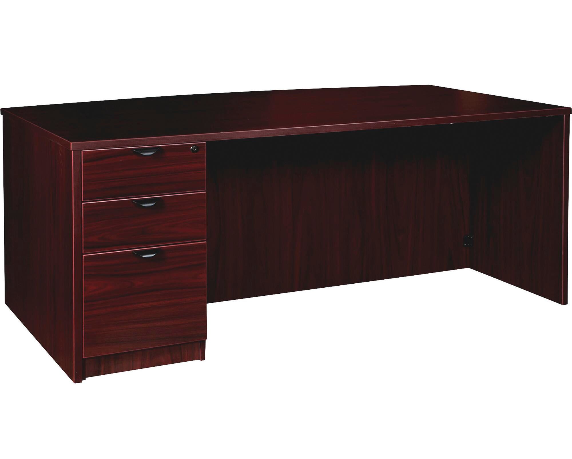 Left-pedestal desk pairs perfectly with single-pedestal desks, returns and bridges to create L-shaped and U-shaped configurations. Durable, mahogany laminate surface is mar-resistant, burn-resistant and impact-resistant to withstand daily work life. The 1-inch thick top with matching 3mm edgebanding is made with 45-pound density particleboard and finished on both sides with high-performance, thermally fused melamine. The 72-inch wide desk features a full modesty panel for privacy, two grommets in the top, and a full pedestal with locking drawers to secure files and supplies. Pedestal includes two box drawers for supplies and one file drawer for letter-size or legal-size hanging files with included hangrails. Box and file drawers have 100 pounds full-suspension, ball-bearing slides. The 3/4-inch adjustable glides allow desk to remain level on uneven surfaces. Ships fully assembled.Includes:
