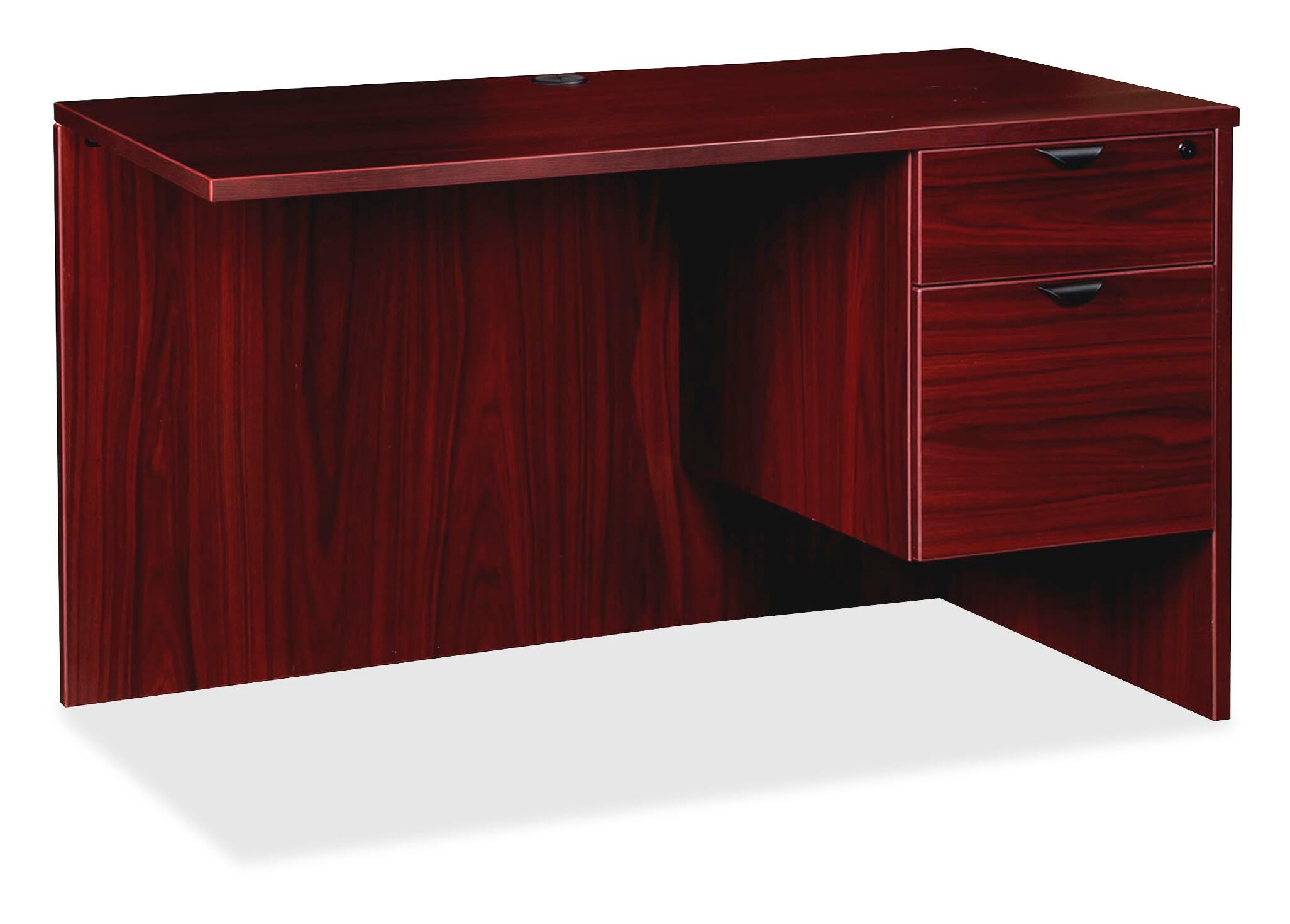 Right-pedestal return desk pairs perfectly with single-pedestal desks to create L-shaped and U-shaped configurations; desk is not freestanding. Durable, mahogany laminate surface is mar-resistant, burn-resistant and impact-resistant to withstand daily work life. The 1-inch thick top with matching 3mm edgebanding is made with 45-pound density particleboard and finished on both sides with high-performance, thermally fused melamine. Return features a full modesty panel for privacy and a 3/4 pedestal with locking drawers to secure files and supplies. Includes one box drawer for supplies and one file drawer for letter-size or legal-size hanging files with included hangrails. Box and file drawers have 100 pounds full-suspension, ball-bearing slides. The 3/4-inch adjustable glides allow return to remain level on uneven surfaces. Grommet in the top worksurface allows convenient cord management.Includes: