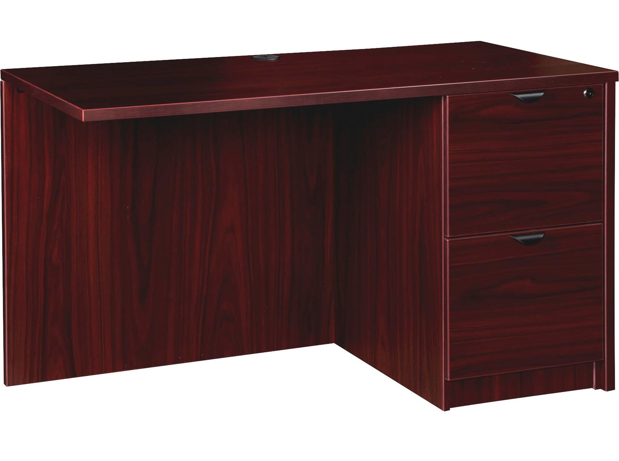 Right return desk pairs perfectly with left-pedestal desks or credenzas to create L-shaped and U-shaped configurations. Durable, mahogany laminate surface is mar-resistant, burn-resistant and impact-resistant to withstand hectic, daily work life. The 1-inch thick top with matching 3mm edgebanding is made with 45-pound density particleboard and finished on both sides with high-performance, thermally fused melamine. Return features a full modesty panel and a full pedestal with two locking file drawers to secure important files. File drawers hold letter-size or legal-size hanging files with included hangrails and have 100 pounds full-suspension, ball-bearing slides. The 3/4-inch adjustable glides allow return to remain level on uneven surfaces. Grommet in the top worksurface allows convenient cord management. Ships fully assembled.Includes: