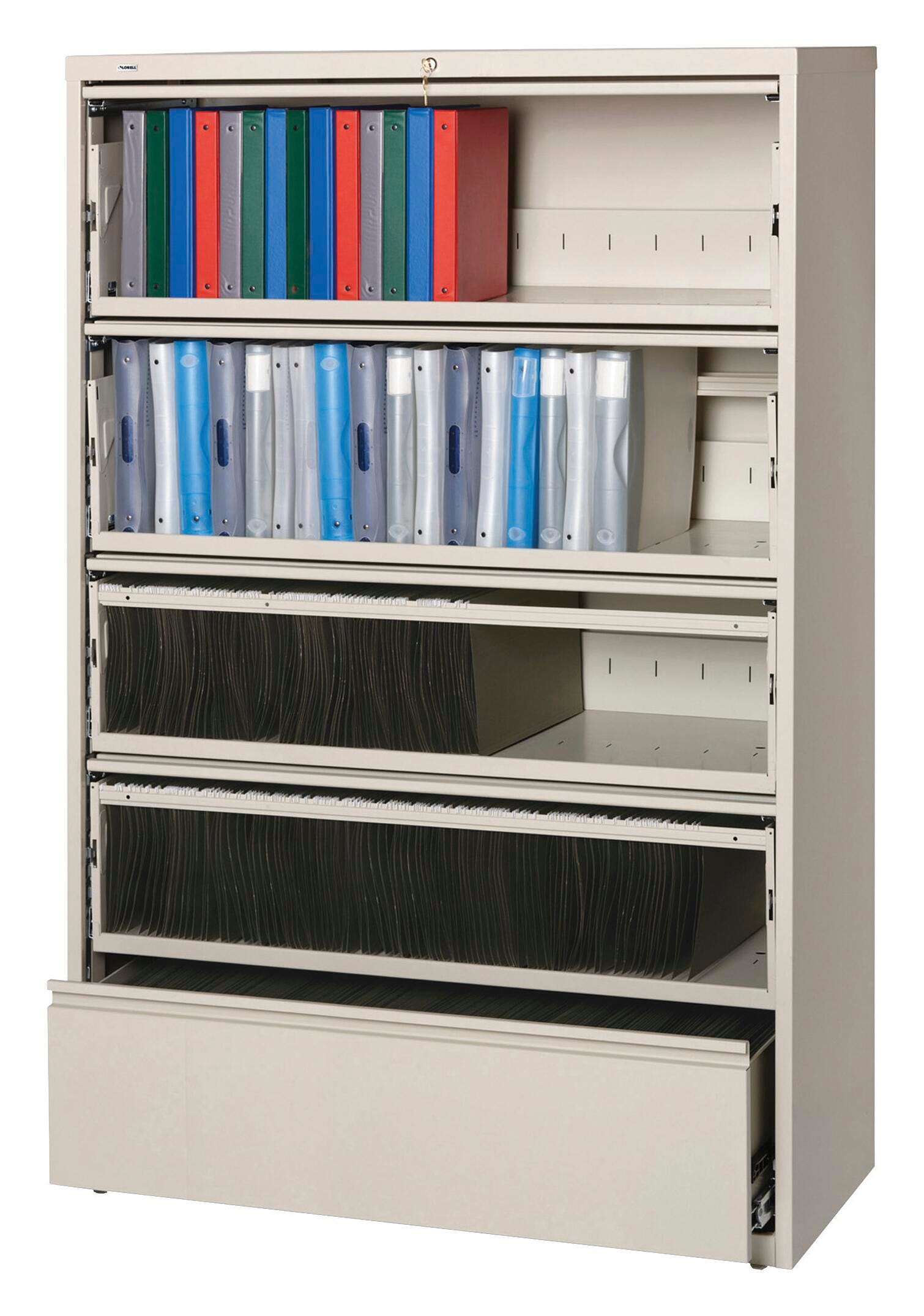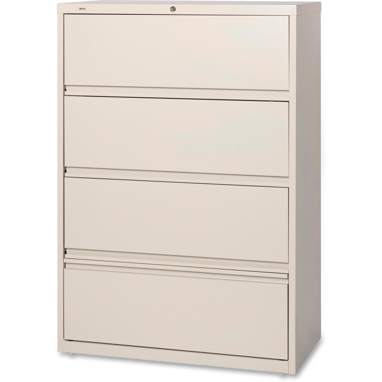 Receding lateral file with roll-out shelves offers-Drawers with heavy-duty, three-piece, ball-bearing slide suspension for smooth-Drawer movement. All-Drawers above the bottom one have receding fronts and roll-out shelves for easy access to your files. Bottom-Drawer has a fixed front. Included hangrails accommodate side-to-side filing of letter, legal or A4-size folders. Dual lock bars secure both ends of-Drawers. Interlock system prohibits the extension of more than one-Drawer at a time. Lateral file also features a core-removable lock; full-width, designer-Drawer pulls; four adjustable leveling guides for stabilization and reinforced double-base construction. Lateral file does not include dividers. File meets/exceeds applicable ANSI/BIFMA standards.