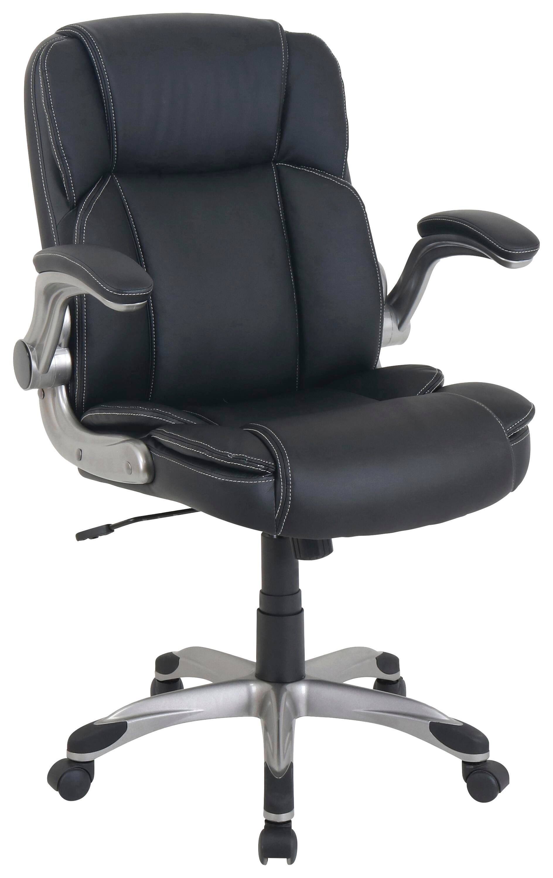 Rolling chair features a bonded leather exterior with sleek stitching to provide timeless style that blends with virtually any room. Armrest with a soft upholstery pad flips up for added convenience. Padded design offers comfortable support through extended periods of seating. Seat-height adjustment with tilt allows a variety of users to sit comfortably at their desk. 360-degree swivel allows you to effortlessly rotate the chair for added convenience.