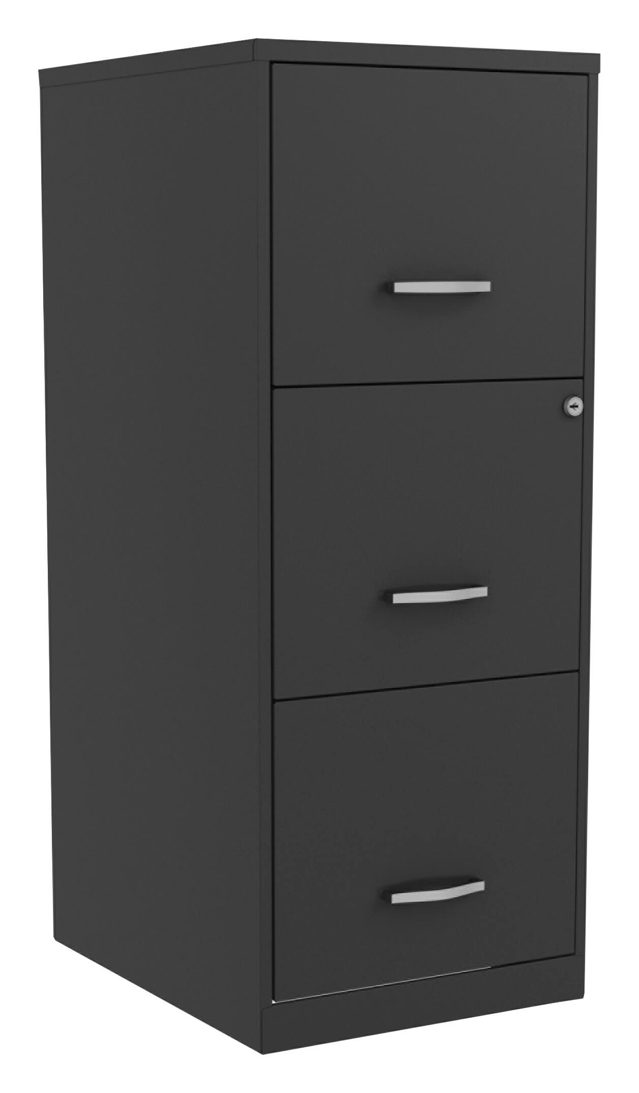 Vertical file cabinet features three file drawers with smooth-glide suspension to store your important documents. The three full high-side drawers accommodate letter-size, hanging file folders. The lock secures the two top drawers. SOHO File Cabinet also includes an 18 inch depth, chrome pull handles and steel construction with a baked enamel finish.
