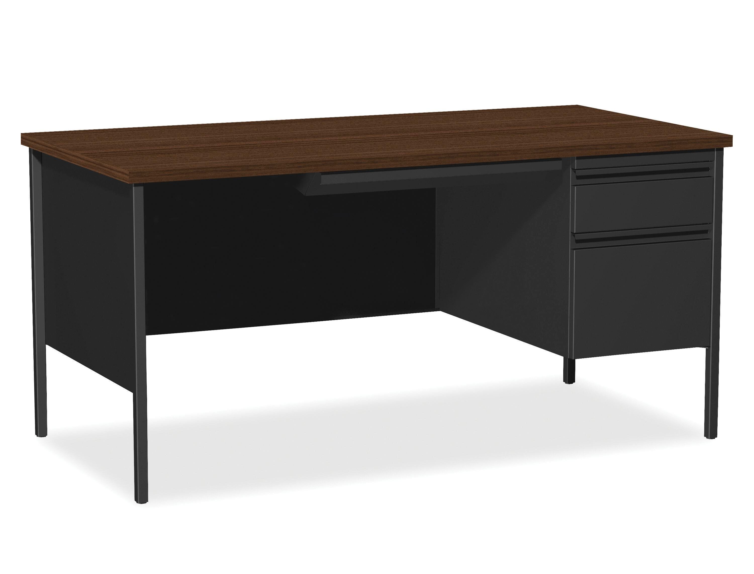 Lorell Fortress Series Desk offers a practical and professional desk solution ideal for business, government and educational offices. Durable, high-performance steel construction withstands rigorous daily use. The 1-1/8 inch thick top with square edges features a Walnut laminate surface that is scratch-resistant, stain-resistant and water-resistant. Desks are also equipped 3/4 modesty panels and box/file pedestals with full-extension, ball-bearing slides and a locking center drawer. Integrated drawer pulls are full-width. Central-locking center drawer on desks include a core-removable lock. Reinforced, double-frame inner structure keeps desk solid and sturdy for years of use. Steel Desk meets or exceeds ANSI/BIFMA standards. Each unit is sold separately.