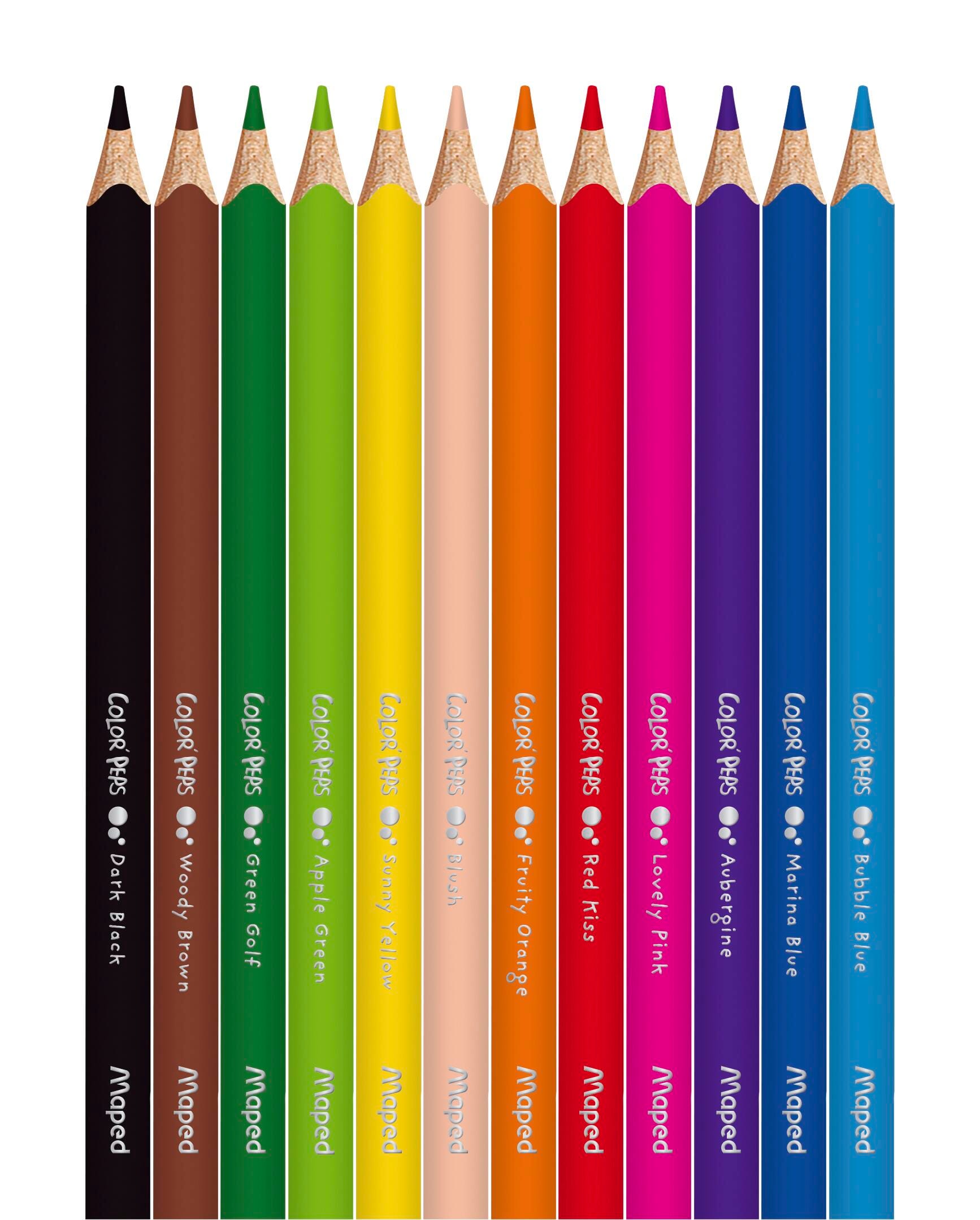 Add some color to your creative life with Maped Color'Peps Colored Pencils, now in a JUMBO size! Each pencil has a strong, extra-thick triangular body shape that is easy to grip; and strong wood cases and 5 millimeter (maximum break-resistant) cores make them an ideal choice for small but strong hands--especially perfect for Special Needs, Art Therapy, Pre-School, and Early Learners! Triangular shape (recommended most by teachers) guides fingers to a proper writing grip and promotes more purposeful and controlled drawing. Non-toxic; AP approved.Features