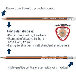 Maped Graphite Pencils are an ergonomic triangular shape that positions the fingers correctly for the utmost in writing comfort and control. Easy for young hands to grip correctly and will not roll! White vinyl erase that is latex and phthalate free. Durable Elmwood construction. Uses standard Number 2 graphite lead.Features