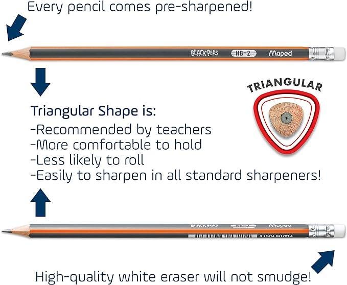 Maped Graphite Pencils are an ergonomic triangular shape that positions the fingers correctly for the utmost in writing comfort and control. Easy for young hands to grip correctly and will not roll! White vinyl erase that is latex and phthalate free. Durable Elmwood construction. Uses standard Number 2 graphite lead.Features