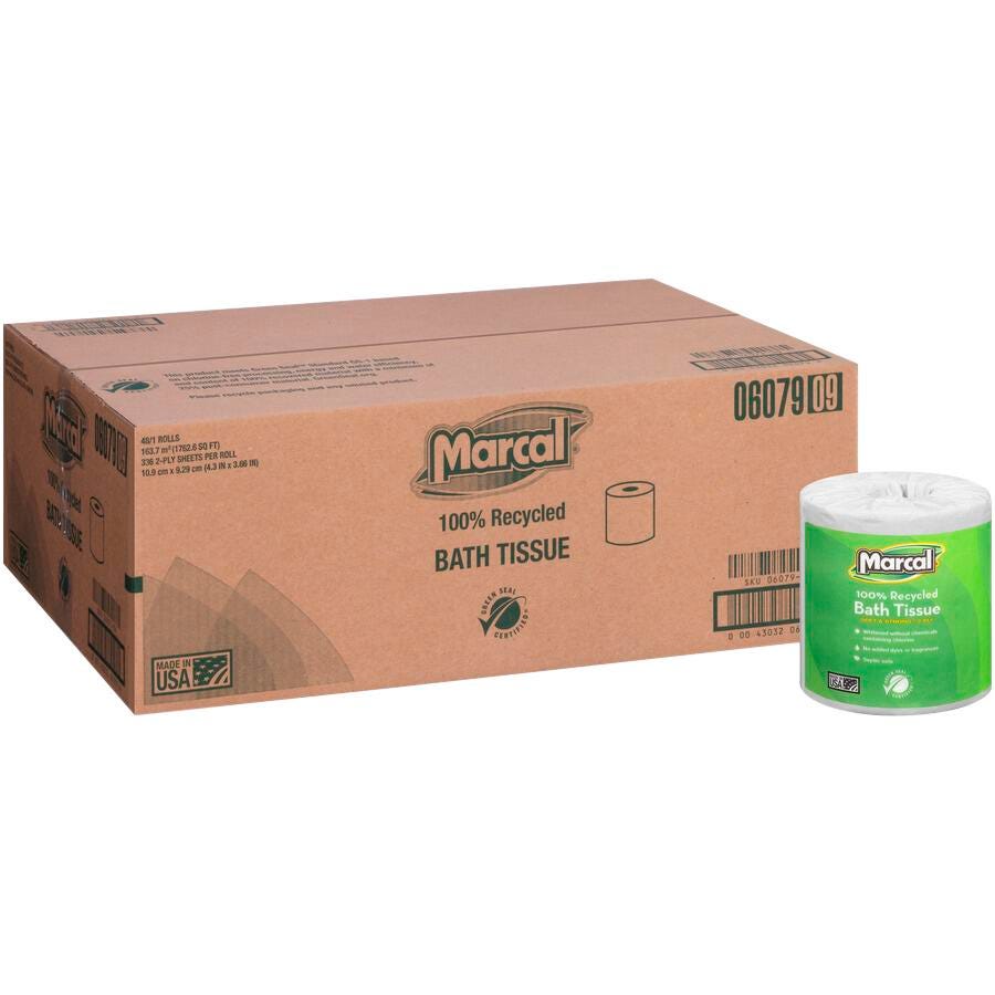 Marcal Small Steps Bathroom White Tissue in an embossed pattern for softness. The tissue rolls are septic safe, virtually lint free and Individually wrapped for cleanliness and storage. 2-Ply tissue made from 100% recycled content with 60% post consumer waste material and roll of 336 sheets is sold as 48 per pack. This item is Eco Friendly.