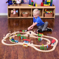 All aboard the train building fun! This colorful, quality 100-piece wooden train set comes with 11 pieces of 6-inch straight track, 10 curved tracks, 1 crossover track, car pieces that connect together with strong magnetic links, and crossing gates to create a realistic roleplay experience right from your childcare center, playroom, or recreational center. And don't forget the plastic signs, animals, and trees to accent the outside scenery! Perfect for developing social skills through group play and language skills through creative play. The longest track piece measures 9-1/2 inches. For ages 3 and up.Features