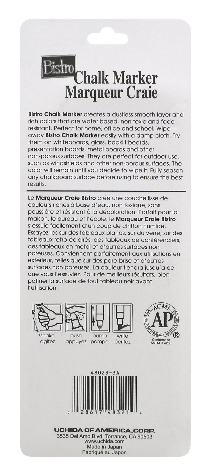 Bistro Chalk Marker creates a dustless smooth layer and rich colors that are water based, non-toxic and fade resistant. Wipes away easily with a damp cloth. Try them on Whiteboards, glass, backlit boards, presentation boards, metal boards and other non-porous surfaces.Features