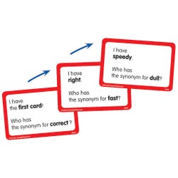 The entire class can have fun while practicing skills in signt words. Hand out all of the cards. The student whose card reads, “I have the first card! Who has…?” begins. The student whose card has the answer to that question responds and then asks a different question. This continues until the person with the last card gives the final answer and then reads, “This is the end of the game!” Each box provides 4 sets of cards for 4 different games.Features