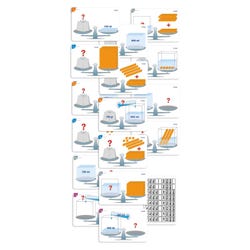 Collection of 16 progressive activities split into 4 series of 4. It is complemented by 72 small cards indicating the quantities in grams (g) and milliliters (ml). All of the worksheets are made of plastic designed for classroom use. The decomposable cubic decimeter activities allow children to discover the correspondence between the different measurement units: the weight, the volume and its representation through pieces of the game, first involving handling and then abstraction and understanding, promoting reasoning. Ages 7 to 9. Multicolor. Plastic activity cards and teaching guide included. Size: 12-1/4 x 8-1/4 inches.Features