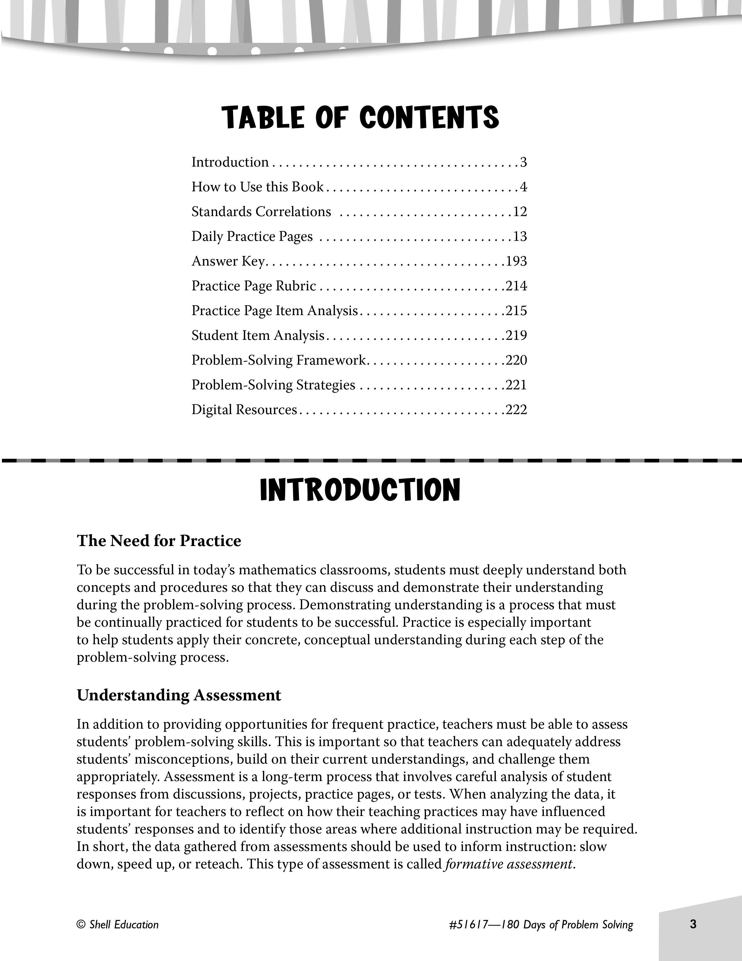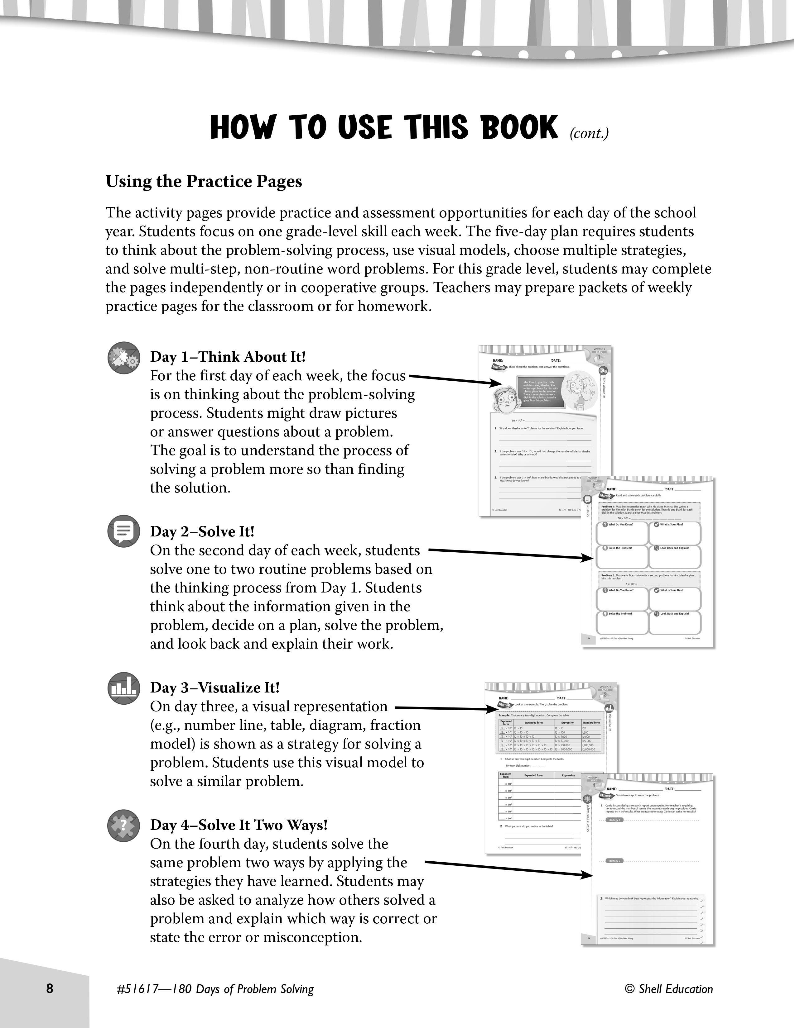 180 Days™ of Problem Solving is a fun and effective daily practice workbook designed to help fifth-grade students improve critical-thinking and reasoning skills. The engaging standards-based activities cover grade-level skills with easy-to-follow instructions and an answer key to quickly assess student understanding. Students will focus on one skill each week to learn the problem-solving process, use visual models, and solve multi-step, non-routine word problems. Watch as students build problem-solving skills with these quick independent learning activities.