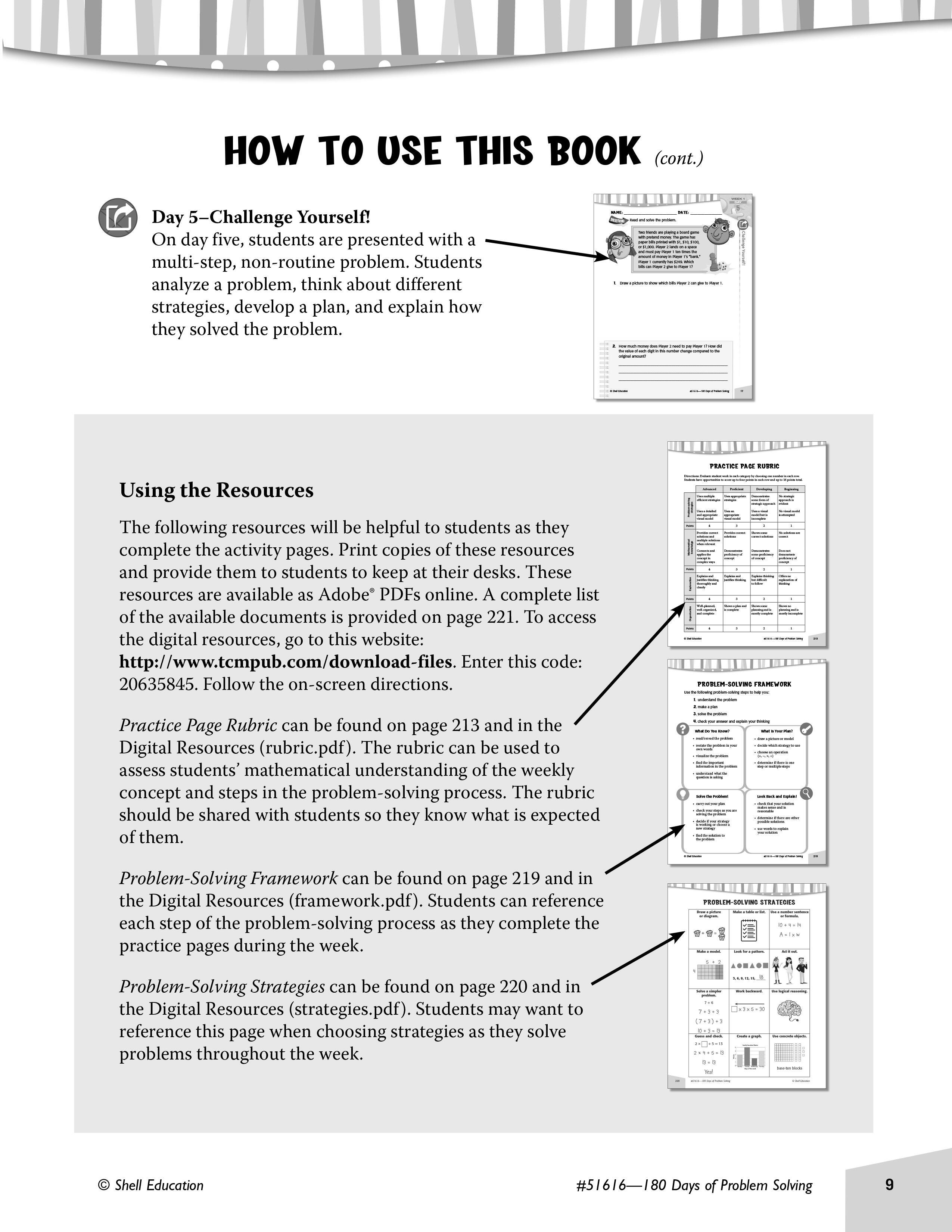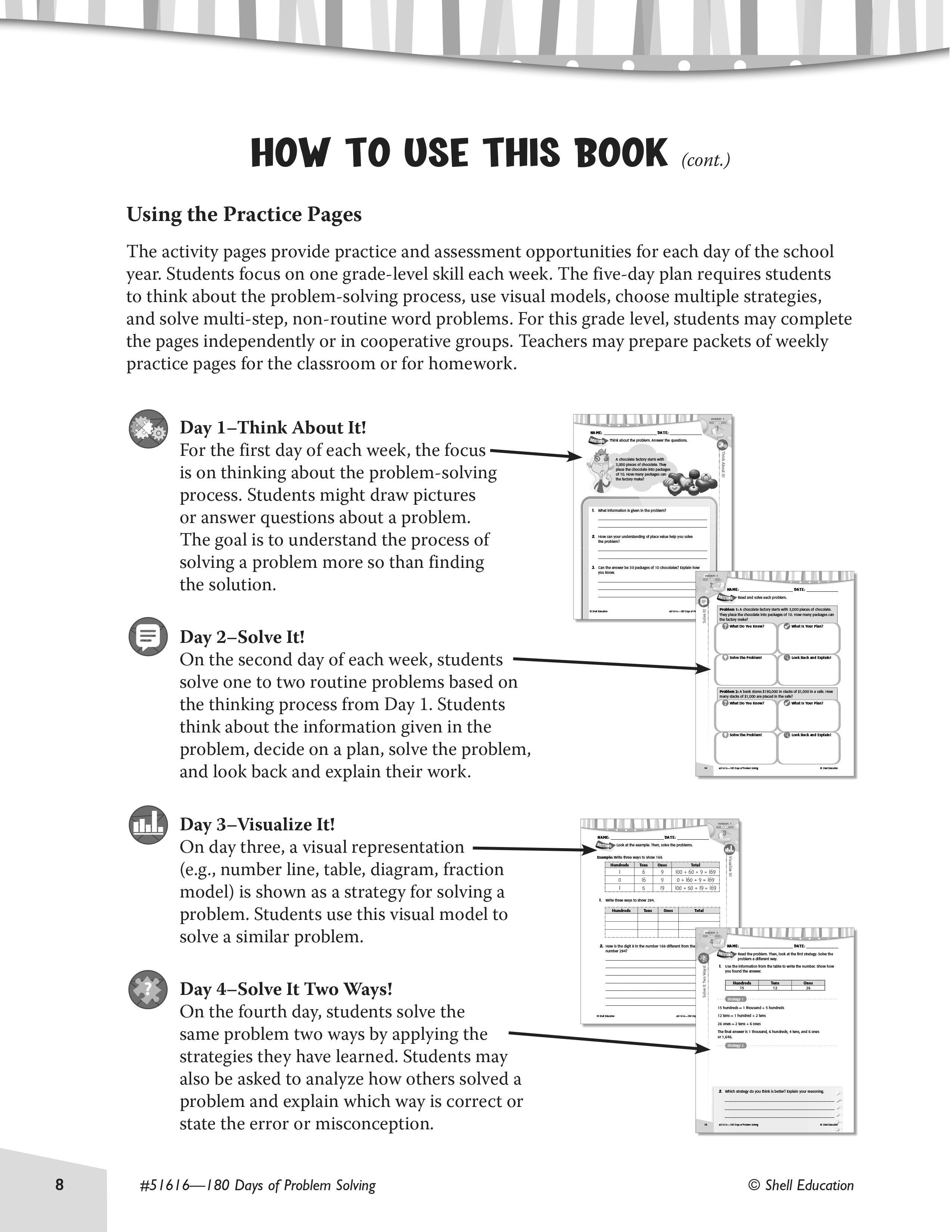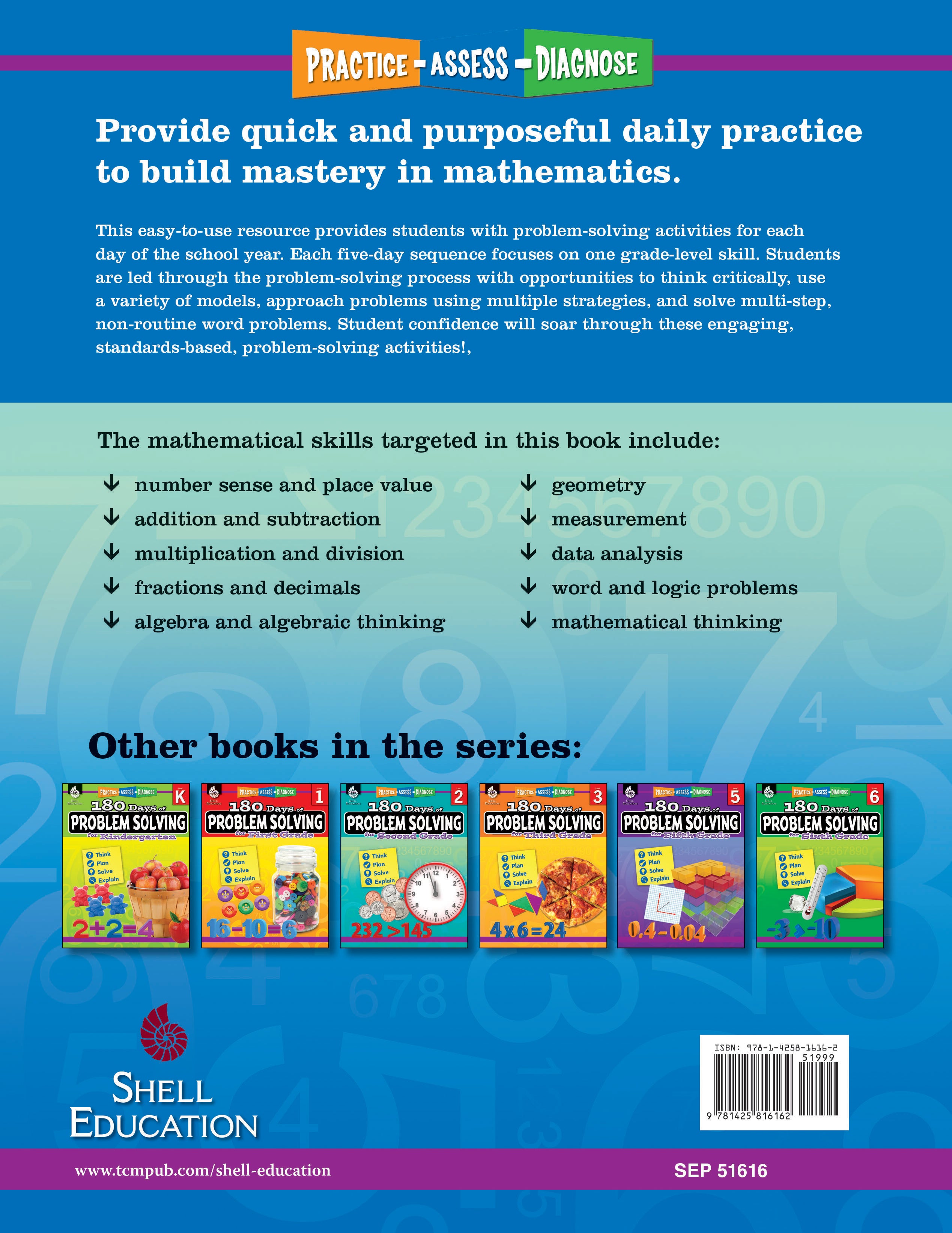 180 Days™ of Problem Solving is a fun and effective daily practice workbook designed to help fourth-grade students improve critical-thinking and reasoning skills. The engaging standards-based activities cover grade-level skills with easy-to-follow instructions and an answer key to quickly assess student understanding. Students will focus on one skill each week to learn the problem-solving process, use visual models, and solve multi-step, non-routine word problems. Watch as students build problem-solving skills with these quick independent learning activities.