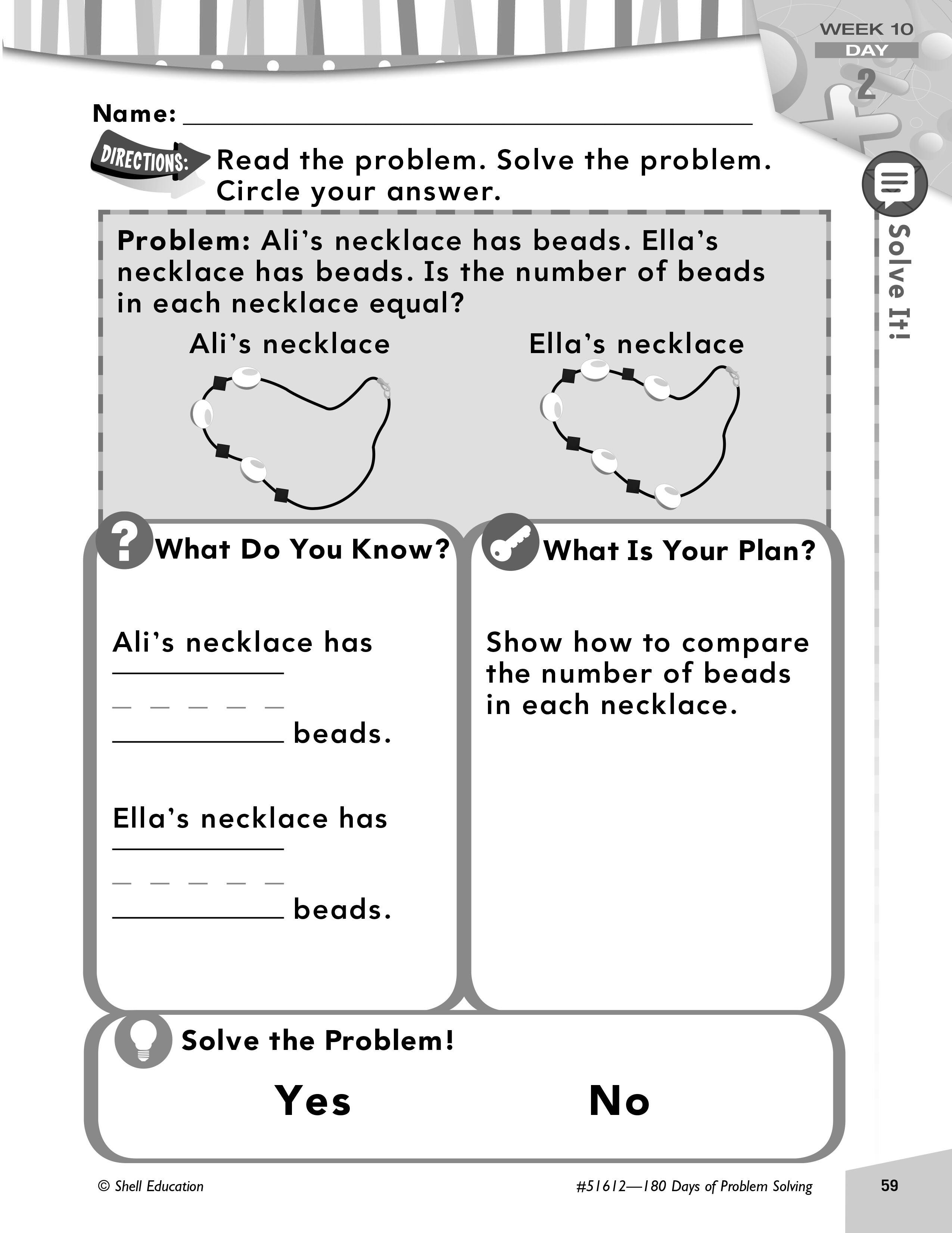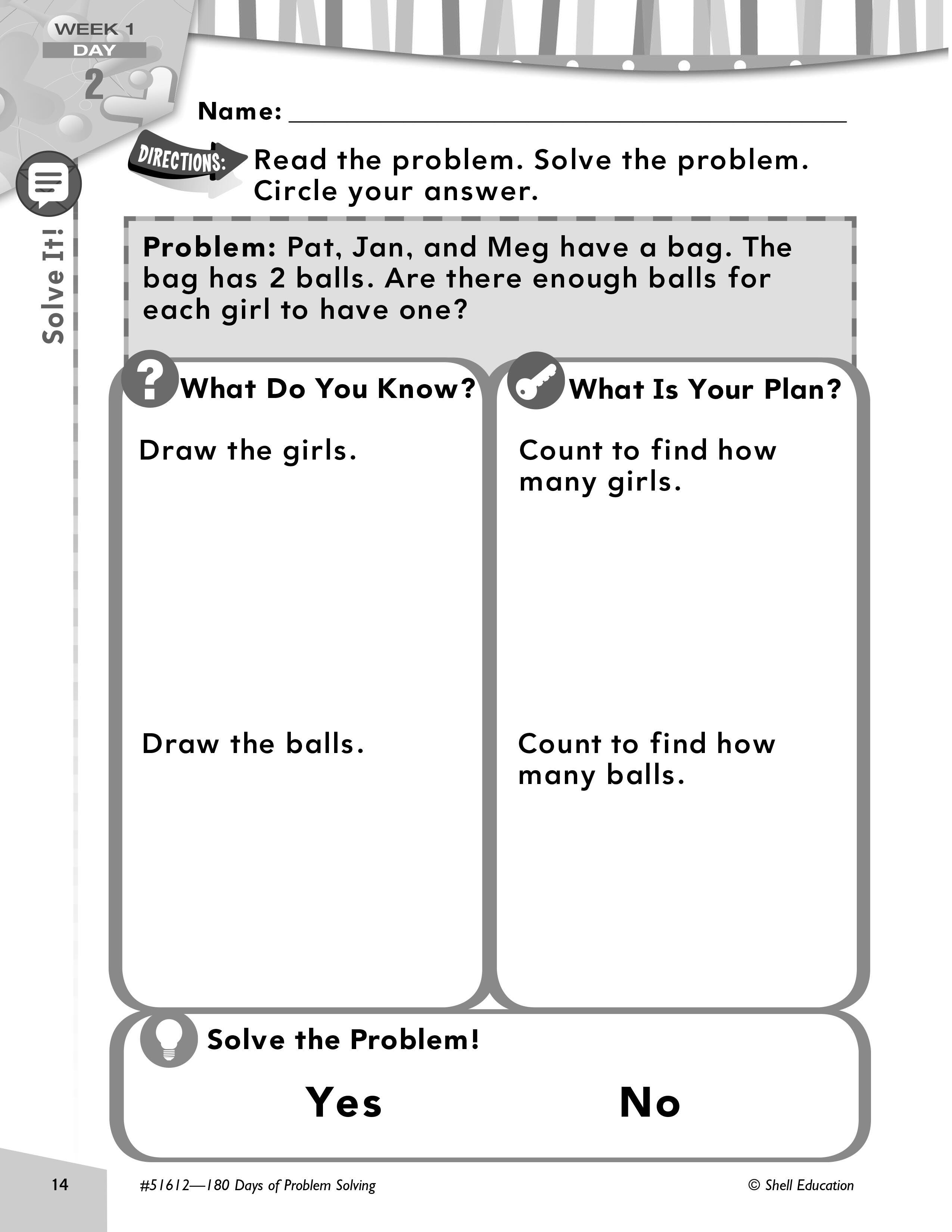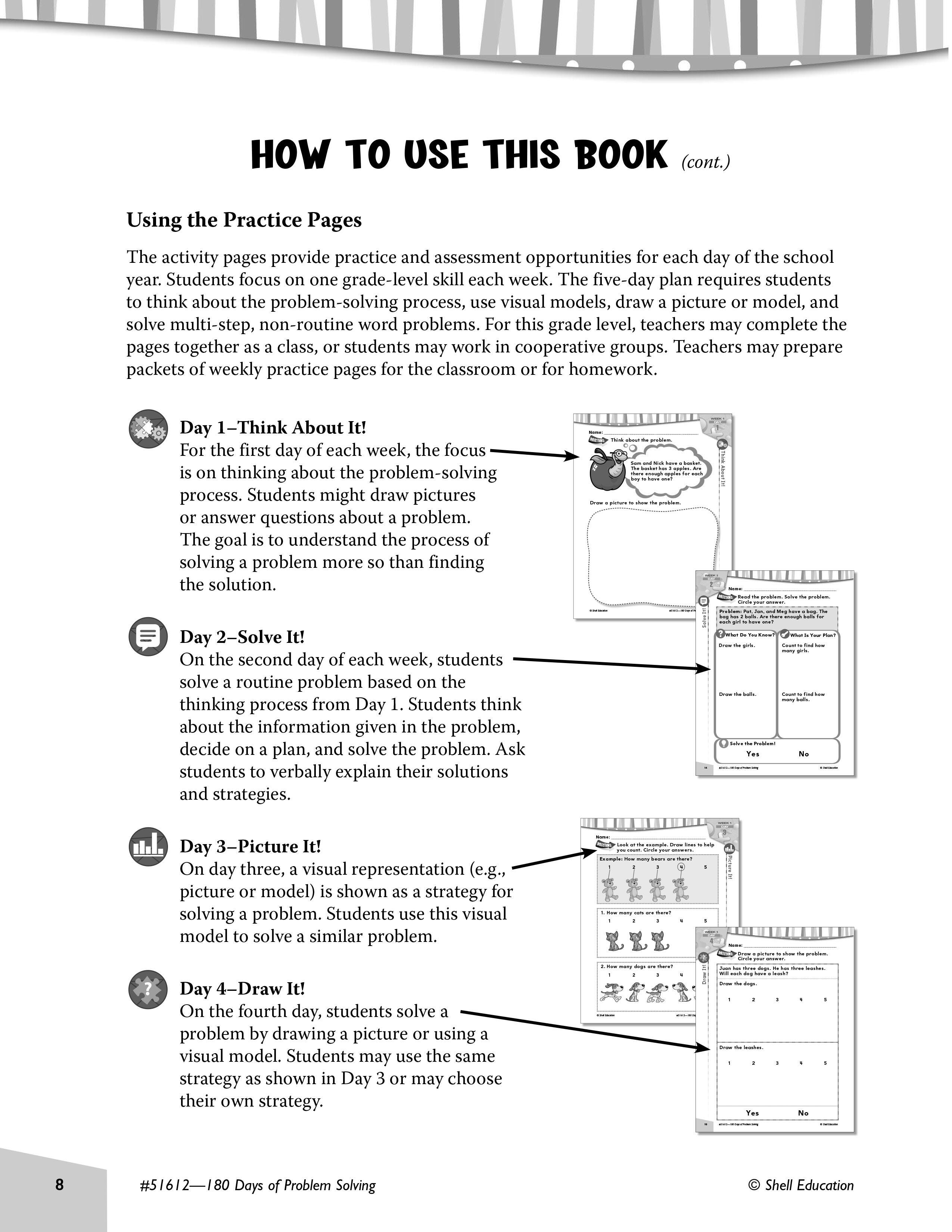 180 Days™ of Problem Solving is a fun and effective daily practice workbook designed to help Kindegarten students improve critical-thinking and reasoning skills. The engaging standards-based activities cover grade-level skills with easy-to-follow instructions and an answer key to quickly assess student understanding. Students will focus on one skill each week to learn the problem-solving process, use visual models, and solve multi-step, non-routine word problems. Watch as students build problem-solving skills with these quick independent learning activities.