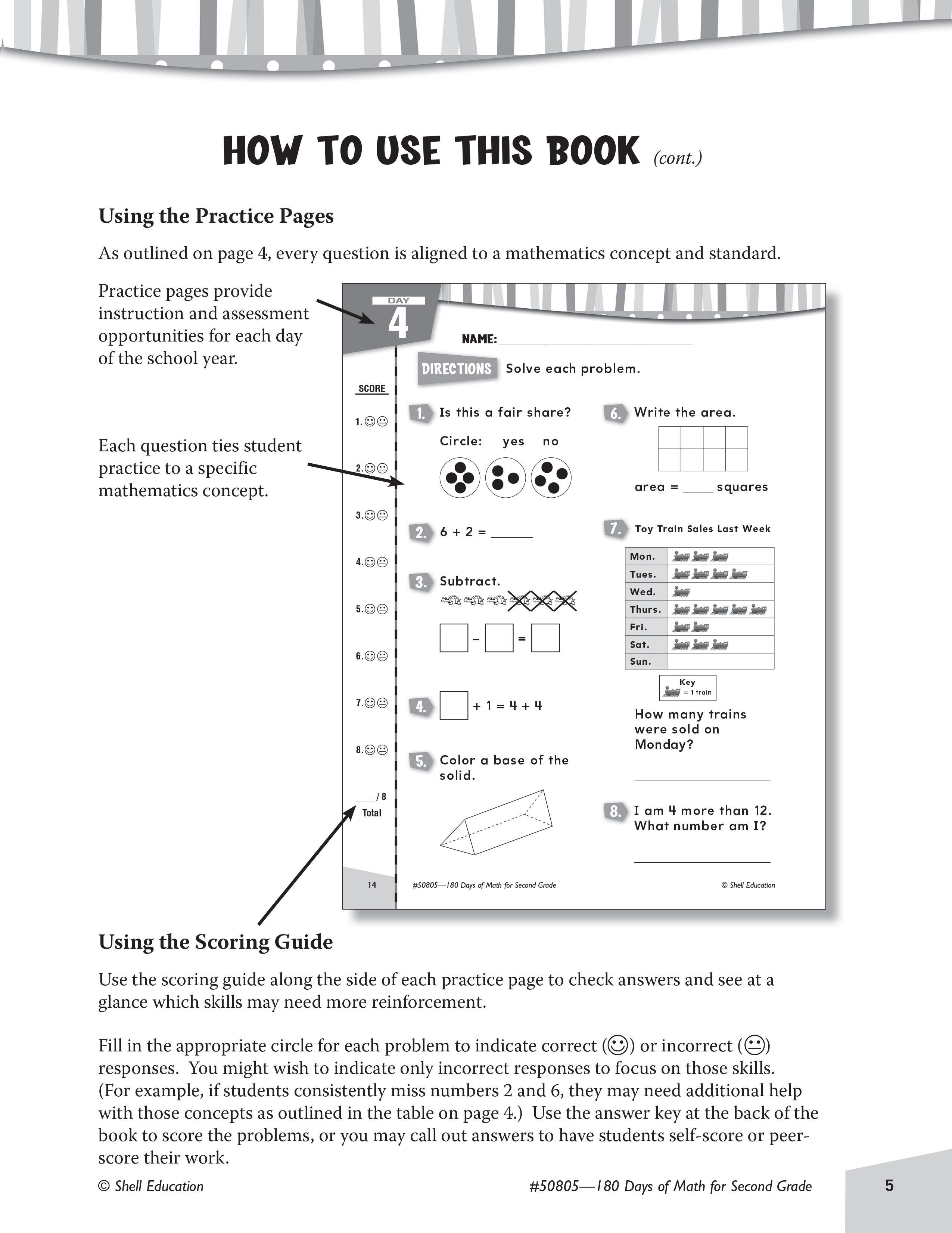 180 Days of Math is an effective workbook designed to help students improve their math skills. This easy-to-use second grade workbook is great for at-home learning or in the classroom. The engaging standards-based activities cover grade-level skills with easy to follow instructions and an answer key to quickly assess student understanding. Each daily practice page includes 8 math problems covering algebraic thinking, numbers and operations, measurement and data, and geometry. Watch as student’s math confidence grows with these quick independent learning activities.Parents appreciate the teacher-approved activity books that keep their child engaged and learning. Great for homeschooling, to reinforce learning at school, or prevent learning loss over summer.Teachers rely on the daily practice workbooks to save them valuable time. The ready to implement activities are perfect for daily morning review or homework. The activities can also be used for intervention skill building to address learning gaps.