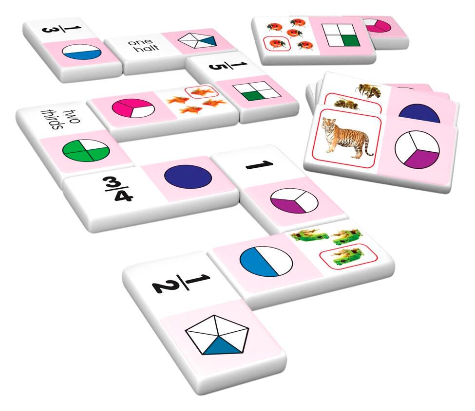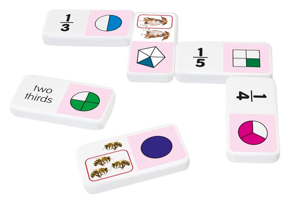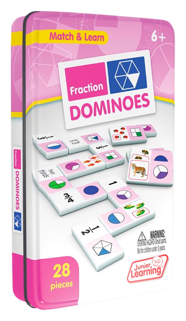 Fraction dominoes include a 28 piece set on thick plastic dominoes. Children will love the feel of real dominoes as they complete the fraction matching game. Appropriate for ages 6-12 years old.Features