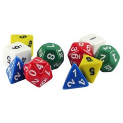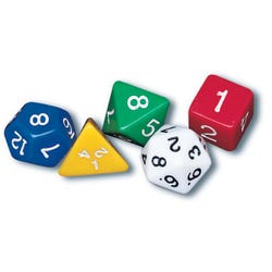 Trade out the traditional die for Polyhedra Dice Set in assorted shapes and colors! These multifaceted, multi-faced die are a great way to introduce number order, probability, greater than versus less than, games like war or role playing, and more. This set of 10 total dice is divided into 2 sets, each with different colors and sides. Dice include two each of 4, 6, 8, 12, and 20 sided dice. Ideal for Grades K to 6. Not for children under age of 3.Features