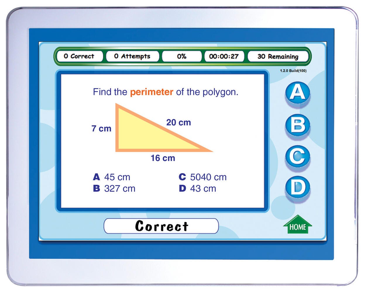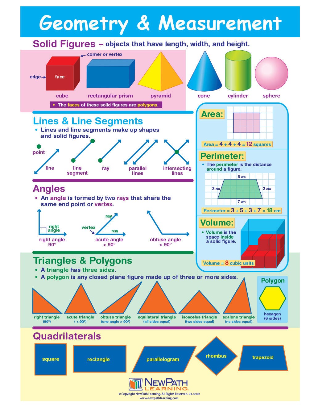 The perfect complement to any Math program, the set includes 10 laminated, “Write-on/Wipe-off” guides. Each 17 x 11 inch laminated guide covers a different topic and includes 4 panels featuring an illustrated overview of the concept; labeling & review exercises; a graphic organizer of the topic; and assessment/review questions. The set also includes a Teacher Guide with instructions for successful classroom integration and a 1-Year Premium Subscription to NewPath’s Online Learning Program providing access to online quizzes, games, activities, and more! Provides comprehensive coverage of the following topics: Geometry & Measurement; Polygons; Area, Volume & Perimeter; Congruence, Transformation & Symmetry; Lines, Angles & Circles; Surface Area of Solid Figures; Area & Circumference of Circles; Customary & Metric Units of Measurement; Collecting & Displaying Data; and Problem-Solving Strategies.Features